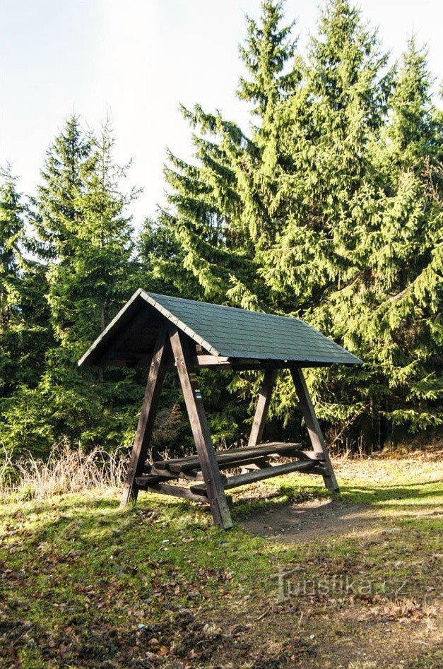První textační informační místo na modré trase z Červenohorského sedla k rozcestí Kamzík nese název Skalní tabule. (Není to křižovatka, pouze průchozí bod). Tabulka značení prozrazuje, že je v místě turistický přístřešek, což celkem každý vidí.