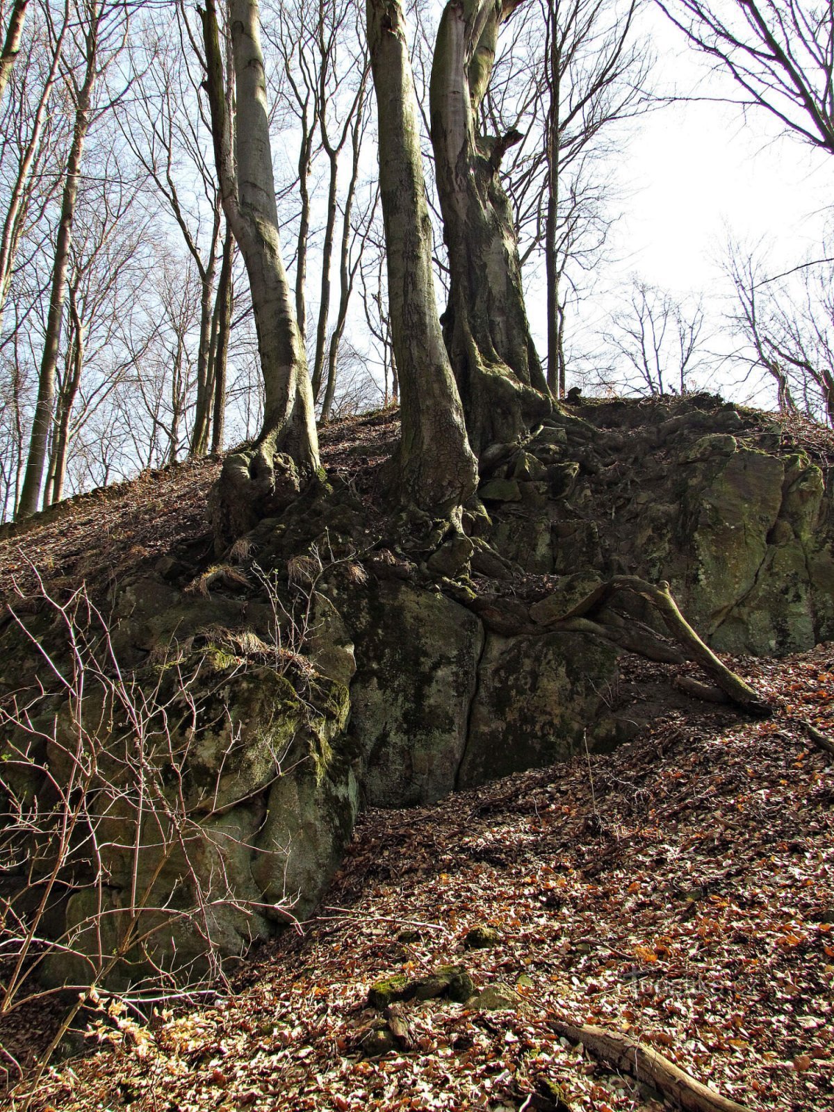 První z nich spatříme na západní straně, kde poblíž hlavního vstupu na zříceninu trčí přímo z hradního příkopu. Tato skála je ale pouze nízkým mrazovým srubem, zkrášleným bizarním bukem nad ním rostoucím.
