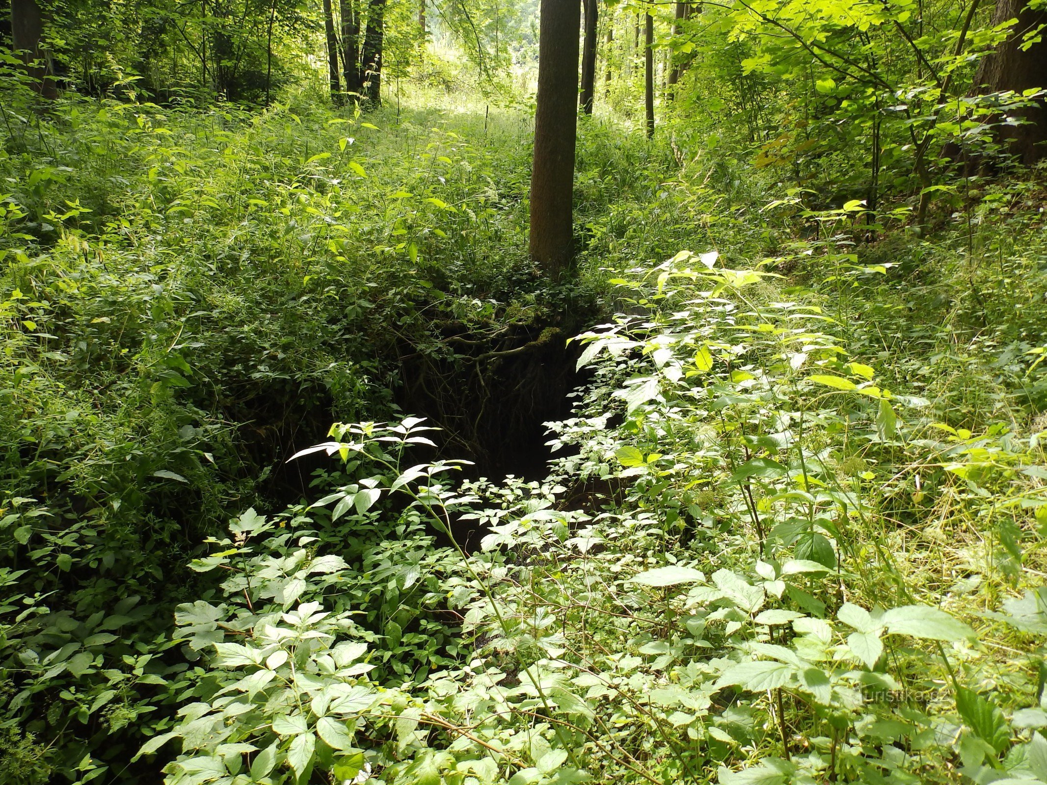 Malý, cca přes 1m vysoký vodopád ukrytý v kořenech stromu. Vznikl tak, že měkké tufové podloží, do kterého se bezejmenný potok zařízl úzkým korytem, postupně, po staletí, vlivem dopadající vody eroduje. A jak tento proces postupuje proti proudu směrem do kopce, zvedá se i jeho výška.