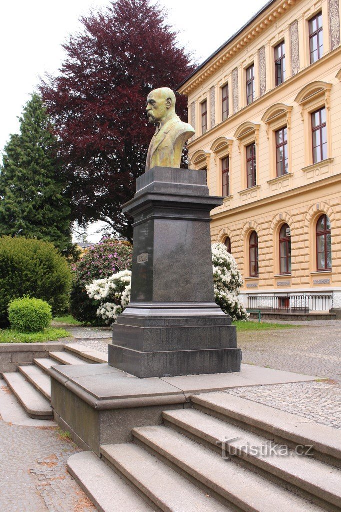 Pomník se nachází před budovou lesnické školy. Základem je tmavý mramorový podstavec, na kterém je umístěno poprsí T. G. Masaryka. Na čelní straně jsou velká písmena T. G. M. Po stranách pomníku je schodiště a za ním až k budově vydlážděná plocha. Pomník je dílem sochaře Alberta Králíčka z Nové Paky. Byl slavnostně odhalen 7. 5. 2008. V okolí pomníků roste několik keřů pěnišníku. Památka…