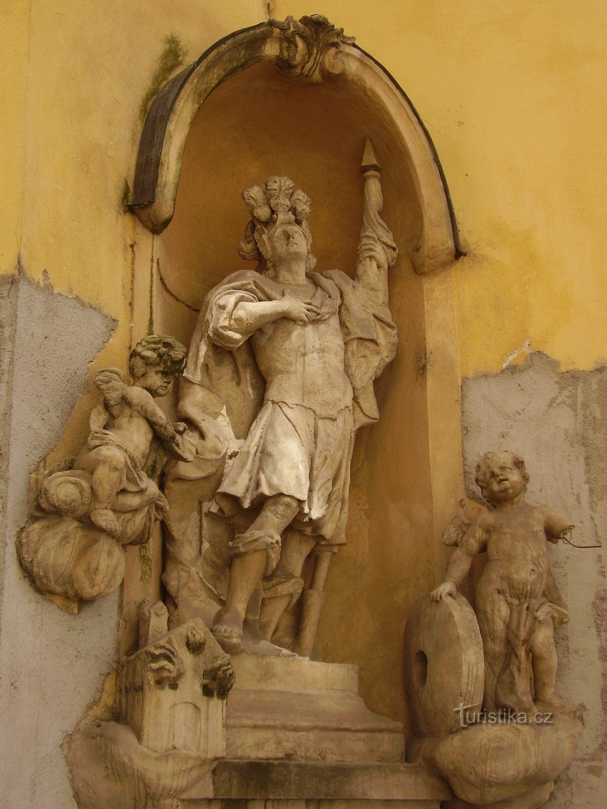 Postava Světce v životní velikosti stojí na nízkém hranolovém soklu. Na sobě má tradiční oděv římského vojáka s helmicí s bohatým chocholem, přičemž pozadí figury tvoří velký…