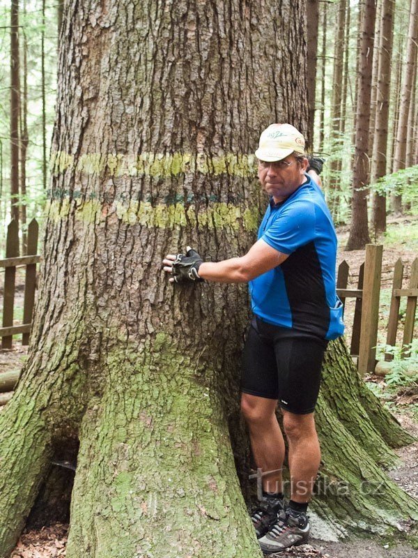 Zhruba 1,5 km za Karlovicemi v Jeseníkách u silnice č 451 směrem na Pocheň a Širokou Nivu v údolí Opavy naproti odbočky lesní cesty (od Karlovic směr doleva) můžeme narazit na pěšinku směřující k řece. Po necelých 100 m najdeme mohutnou jedli bělokorou. Strom je vidět již od cesty, je kolem něj dřevěná ohrádka a informační tabulka. Z té se dovíme že máme před sebou 44m vysoký strom, obvod ve…