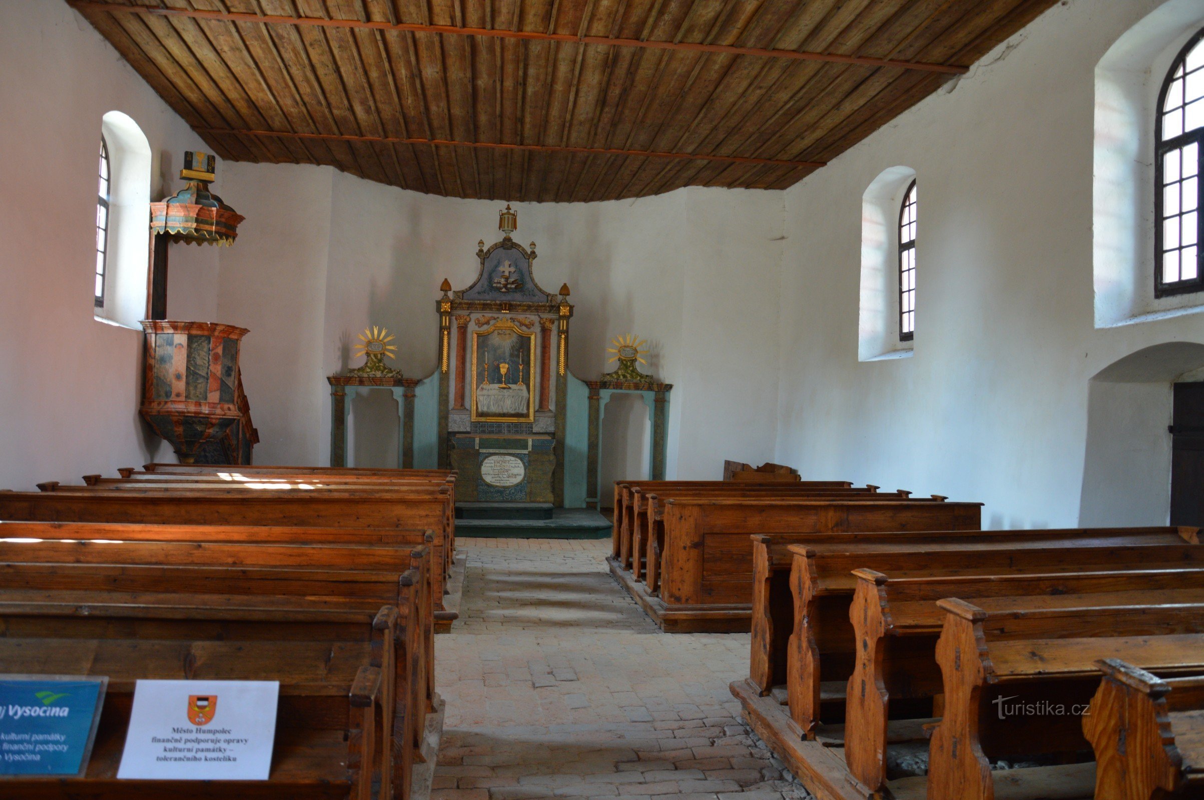 Vedle hřbitova na kopci nad Humpolcem stojí tak zvaný Toleranční kostel. Tolerančních kostelů stojí dosud v Česku několik. Kostel je otevřen v rámci návštěvy skanzenu Zichpil – Nápravníkova stavení. Průvodkyně ze skanzenu v rámci prohlídky otevírá pro návštěvníky tento kostel a podává informaci o jeho významu a historii. Pro mě byla zajímavá informace, jak se již před několika staletími…
