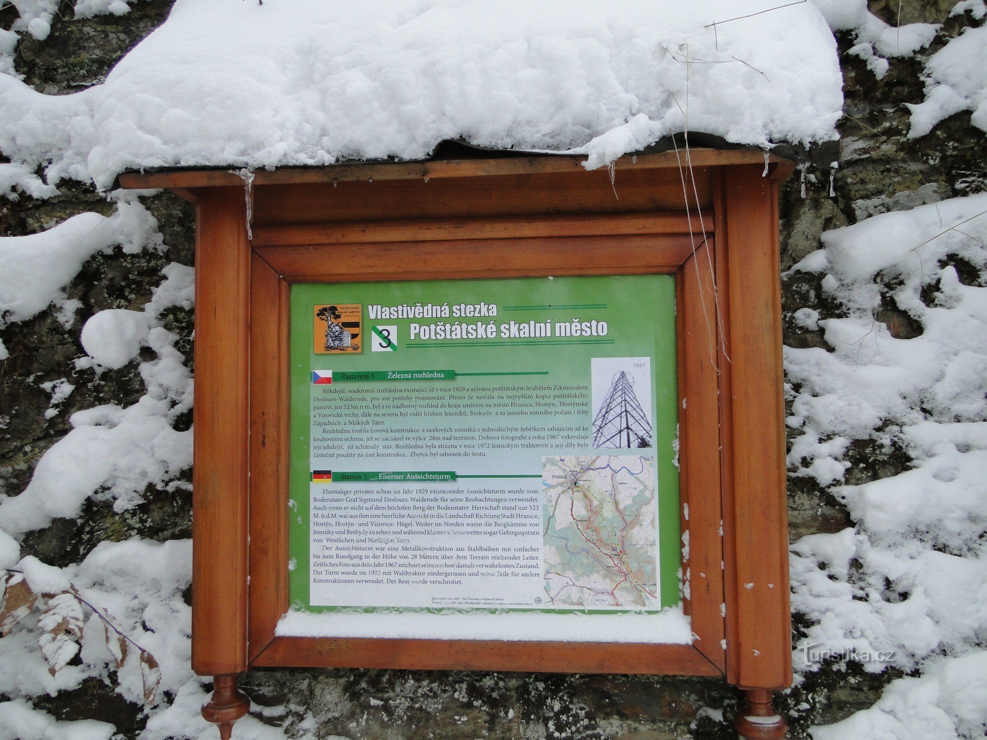 Od roku 1929 stála poblíž kóty 526, ve výšce 523 m/m (GPS: 49°37'5.614"N, 17°40'40.716"E), nad státní silnicí z Olšovce do Potštátu železná rozhledna, kterou si pro své pozorování nechal postavit hrabě Zikmund Desfours-Walderode, majitel zámku a panství v Potštátu. Byl z ní krásný výhled na město Hranice, Sv. Hostýn, Hostýnské a Vizovické vrchy, na severu pak na hřeben Jeseníků, Beskydy a za…