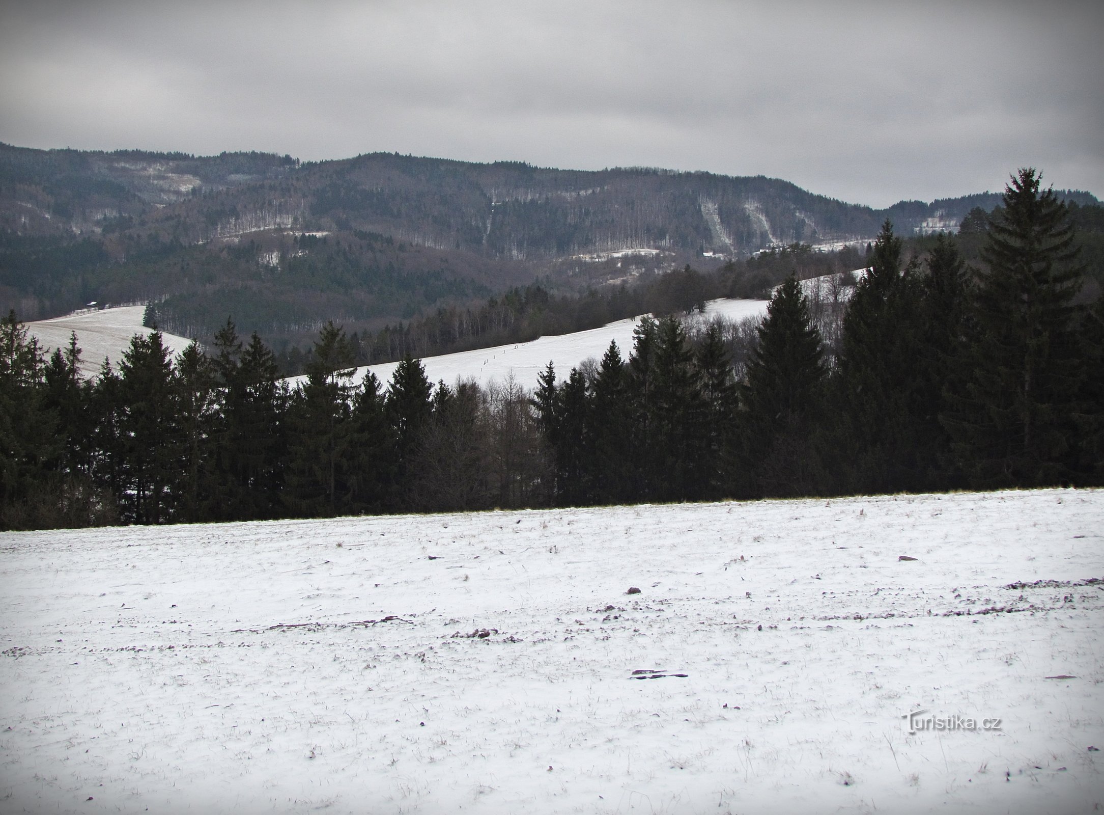 Na zelené turistické trase, sbíhající od rozcestí Papradná do podhorské obce Trnavy, jsem narazil hned na dva zajímavé výhledy. Oba se otvíraly z velké louky nacházející se asi půl kilometru východně od obce, přičemž mne z toho prvního výhledového místa zaujalo panoráma hřebene Hostýnských vrchů s několika jeho význačnými vrcholky.