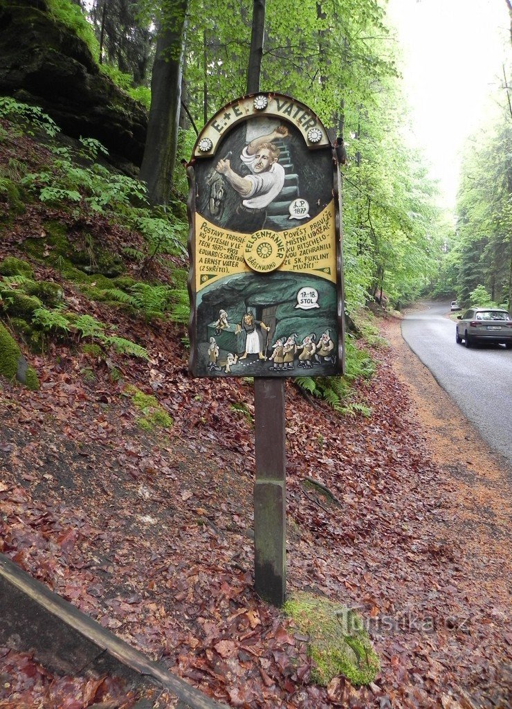 Opouštíme vísku Rynartice a pokračujeme po silnici do Jetřichovic. Silnice se stáčí vpravo a klesá do údolí. V těchto místech začíná les a po obou stranách je několik skalisek. Míjíme kapličku a zastavujeme u dřevěného kůlu s vítací tabulí. Dozvídáme se, že jsme pod Trpasličí skálou a na obrázku vidíme sedm trpaslíků. Na druhé straně tabule je údaj, že trpaslíky vytvořili mezi roky 1870 až 1903…