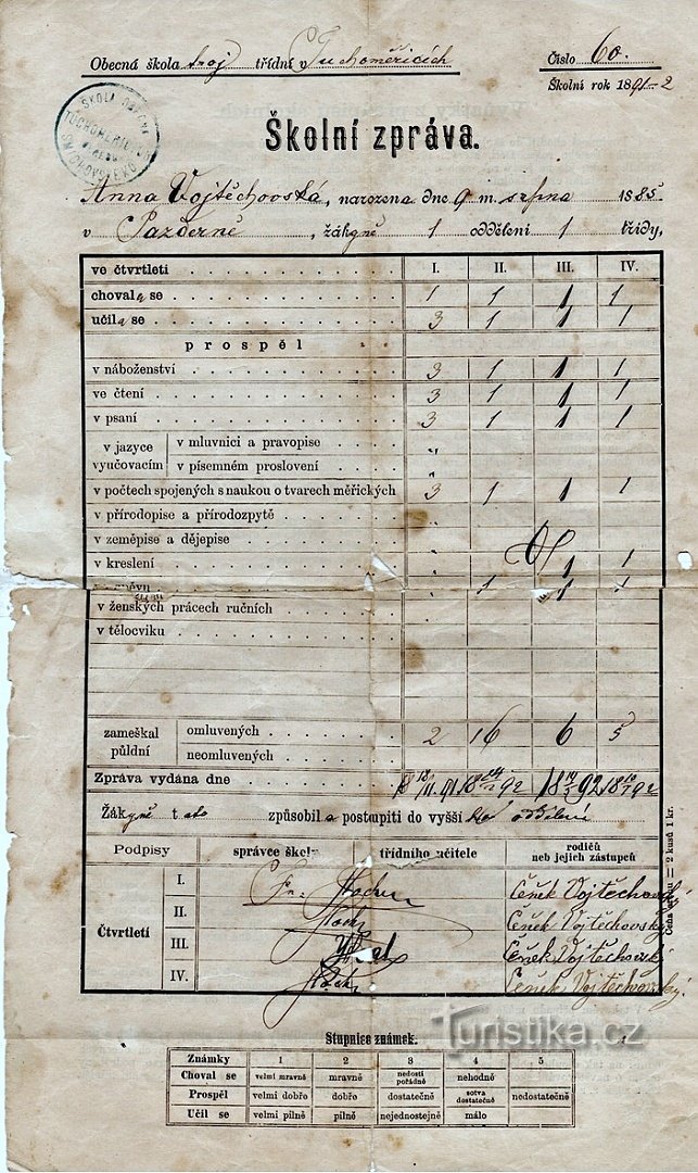Tuchoměřická škola bude zanedlouho slavit 180. výročí své existence. Na portálu nade dveřmi je chronogram skrývající rok výstavby.Snad mi turisté prominou. Není to turistická záležitost, ale pro zajímavost přikládám sken vysvědčení z této školy za školní rok 1891/2. To se vlastně váže k historii školy. Na rubu "Školní zprávy" jsou Vyňatky z předpisů školních. Hezké čtení, třeba odstavců 11. a 12.…