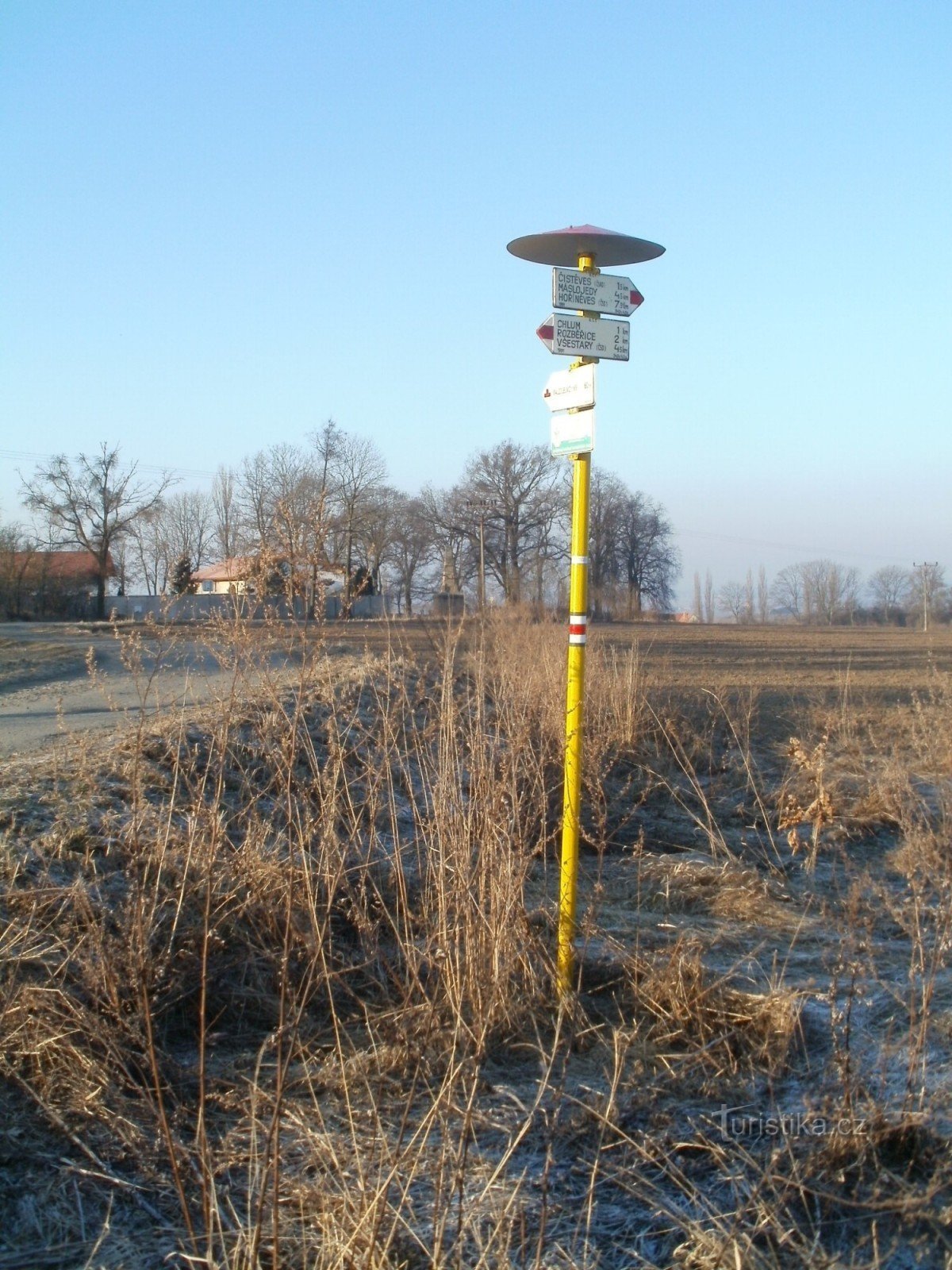 Turistický rozcestník, který se nachází v severní části areálu bojiště na Chlumu u mauzolea, ukazuje turistům cestu po červené značce ve směru Všestary, bojiště na Chlumu - Máslojedy, Hořiněves. Značena je i odbočka k mauzoleu.