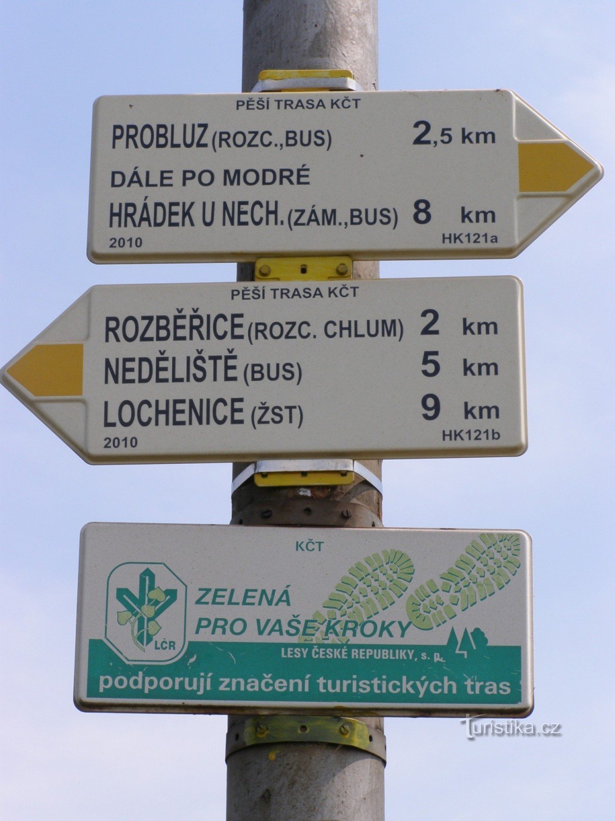 Turistický rozcestník, který se nachází u železniční zastávky Dlouhé Dvory, ukazuje turistům cestu po žluté značce ve směru Probluz, Střezetice - Rozběřice (odb. na Chlum), Neděliště, Lochenice.