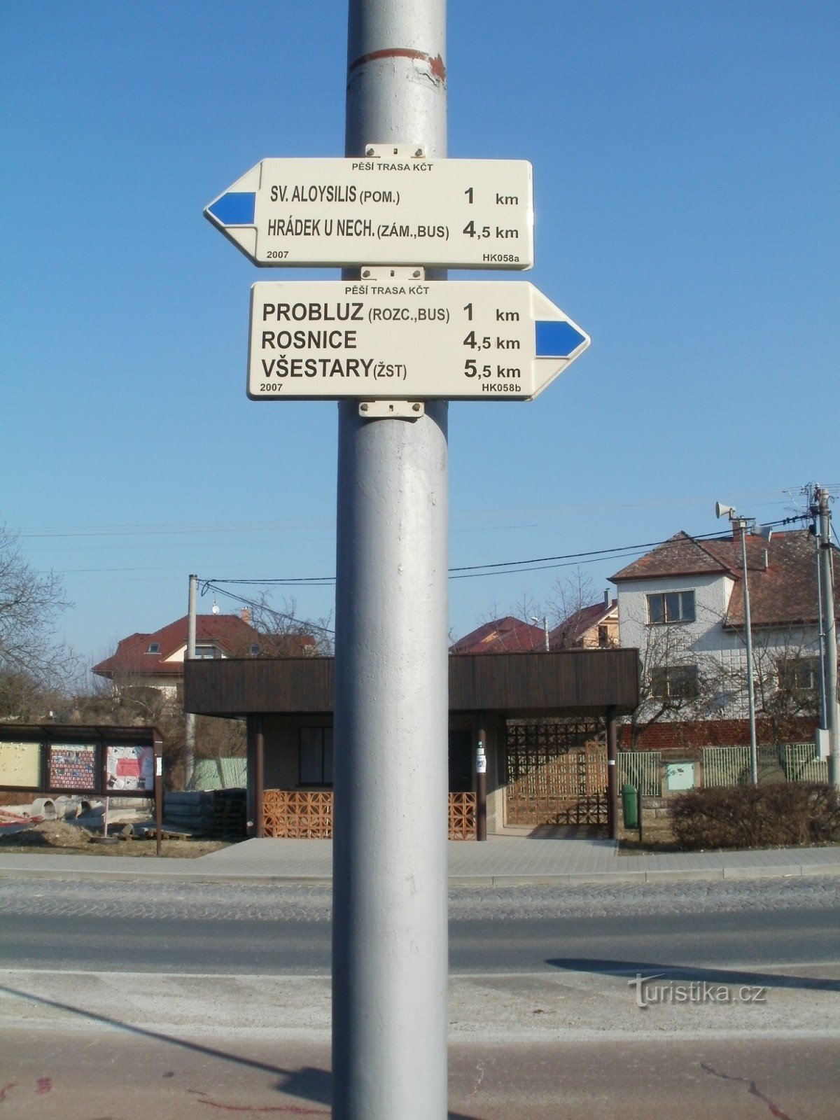 Turistický rozcestník, který se nachází u autobusové zastávky v obci Dolní Přím, ukazuje turistům cestu po modré značce ve směru Hrádek u Nechanic - Všestary žst.