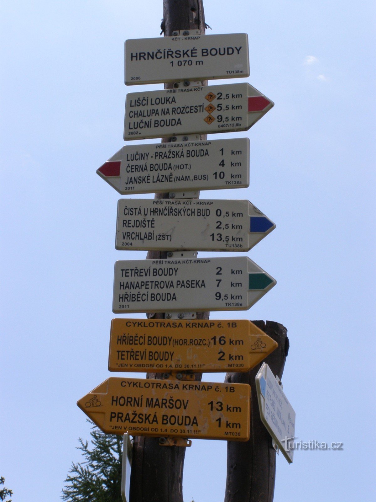 Turistický rozcestník, který se nachází v oblasti zvané Hrnčířské Boudy u Boudy Mír, ukazuje turistům cestu do tří směrů. Po značce červené ve směru Chalupa na Rozcestí, Liščí louka, Lesní bouda, rozc. Pod Lesní boudou - Lučiny, Pražská a Kolínská bouda, Černá Hora, Svoboda nad Úpou, po značce zelené ve směru Hříběcí Boudy, Tetřeví Boudy, Čistá u Hrnčířských bud - Bouda Mír a po značce modré ve…
