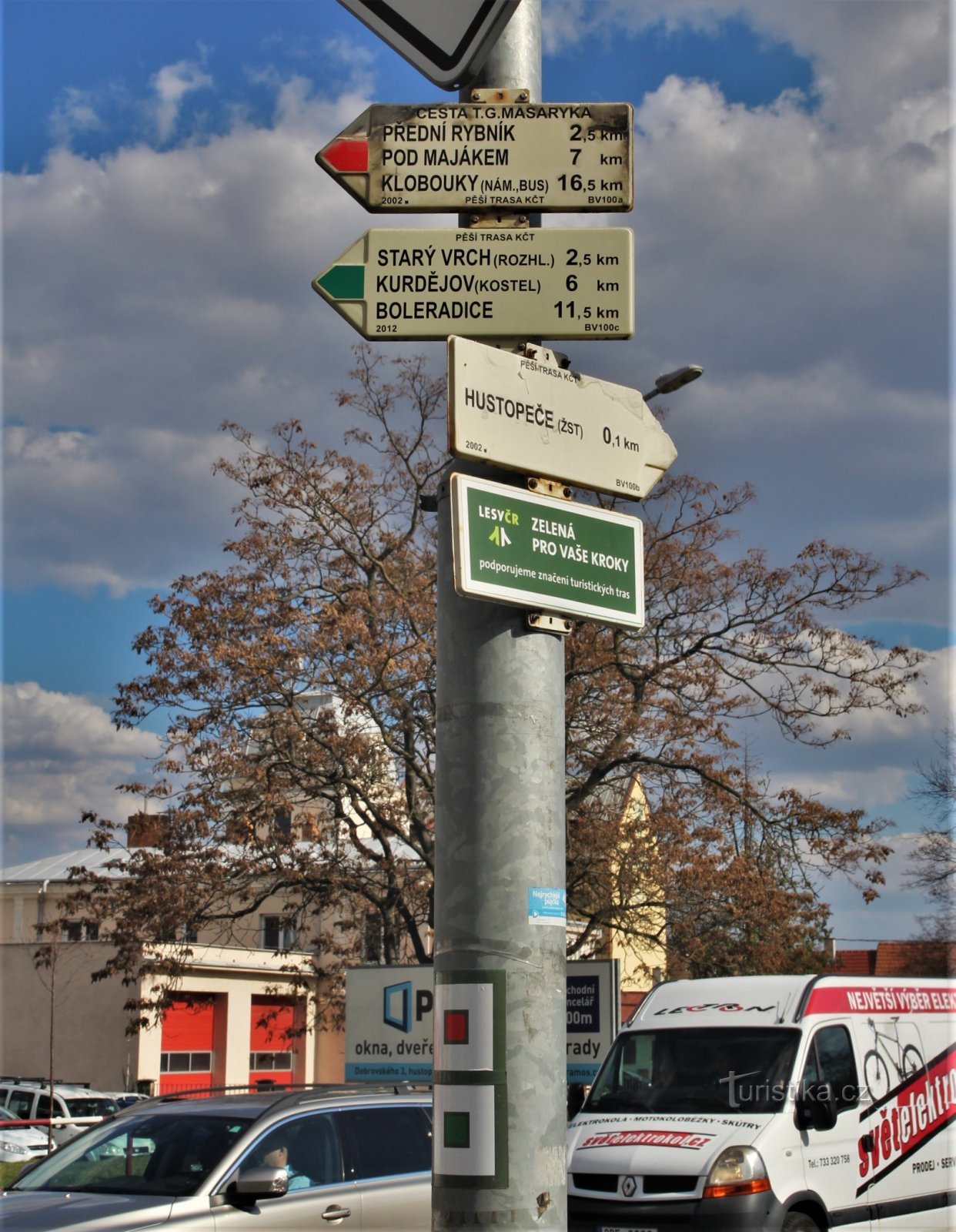 Turistický rozcestník se nachází přímo u autobusového nádraží. Začínají zde červeně a zeleně značené turistické cesty. Červená dálková nese název Cesta TGM, vede z Hustopečí až do Hodonína a mapuje místa pobytu Tomáše G. Masaryka. V hustopečské části cesta vede k Přednímu rybníku, dále na Kamenný vrch, k rozcestí Pod Majákem a přes Diváky přijde do Klobouk u Brna. Zelené značky pak směřují k…