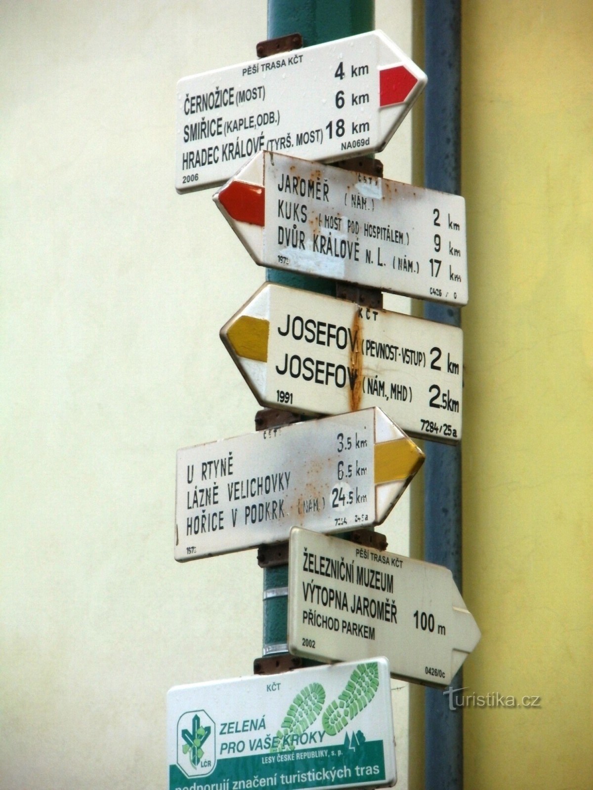 Turistický rozcestník, který se nachází u železničního nádraží v Jaroměři, ukazuje turistům cestu do dvou směrů. Po žluté značce ve směru Hořice, Velký Vřešťov, Velichovky - Jaroměř, Josefov a po značce červené ve směru Hradec Králové, Smiřice - Kuks, Dvůr Králové nad Labem. Samostatně je značen směr k Železničnímu muzeu - Výtopna Jaroměř.