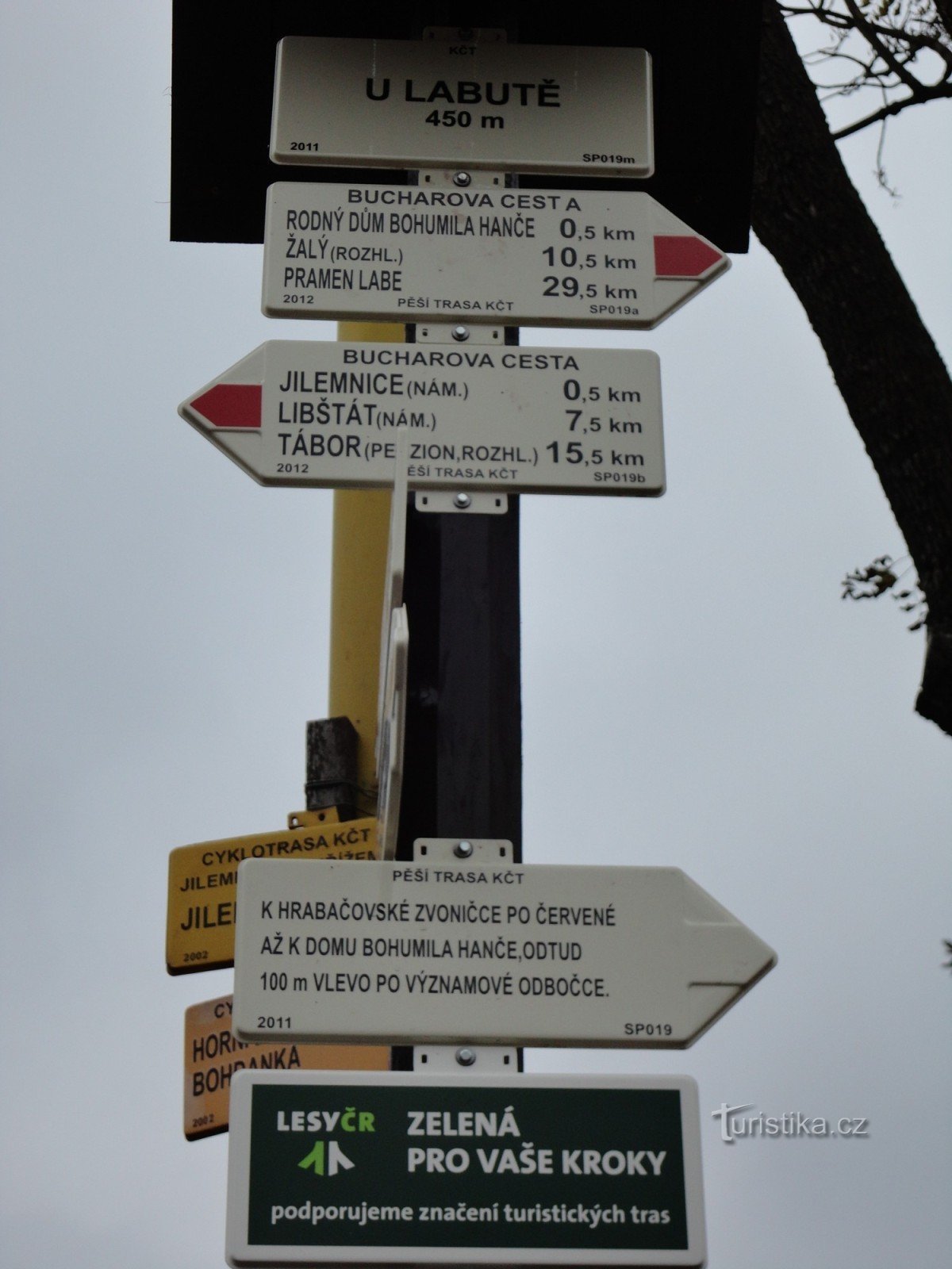 Turistický rozcestník, který se nachází severně od centra Jilemnice v místě zvaném u Labutě, ukazuje turistům cestu do dvou směrů. Po červené značce ve směru Tábor, Lomnice nad Popelkou, Libštát, Jilemnice - Hrabačov, Dolní Štěpanice, Benecko, Žalý, Na Rovince, Horní Mísečky, Vrbatova bouda, Pramen Labe a po žlutě značeném okruhu Jilemnice - Kozinec - Jilemnice, žlutou značku „kopíruje“ NS…