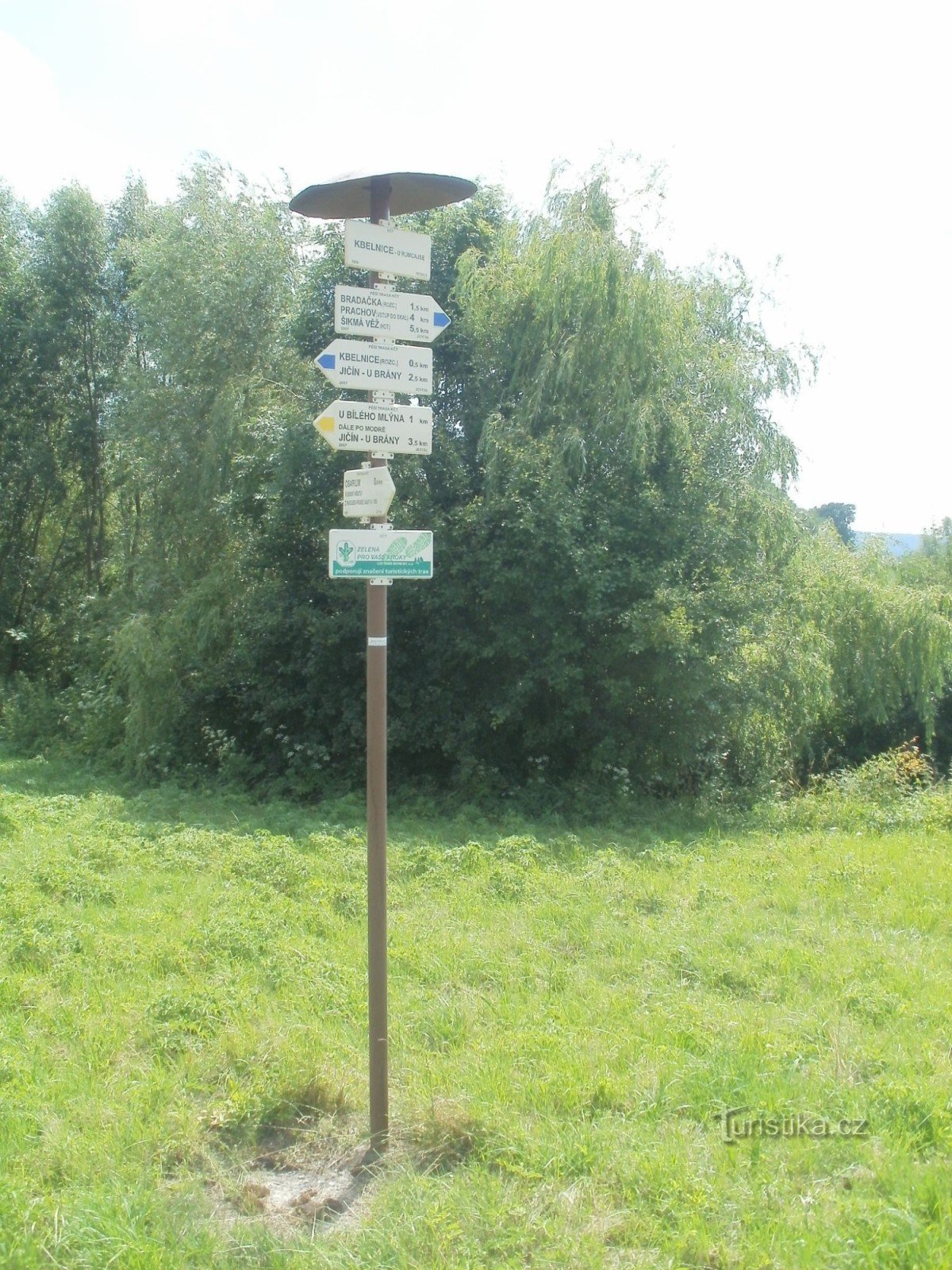 Turistický rozcestník, který se nachází v prostoru křižovatky u známé Hospody u Rumcajse v Kbelnici, ukazuje turistům cestu do dvou směrů. Po modré značce ve směru Jičín - Brada, Prachov, Jinolice a po žluté „spojovací“ značce ve směru U Bílého mlýna - Kbelnice U Rumcajse.