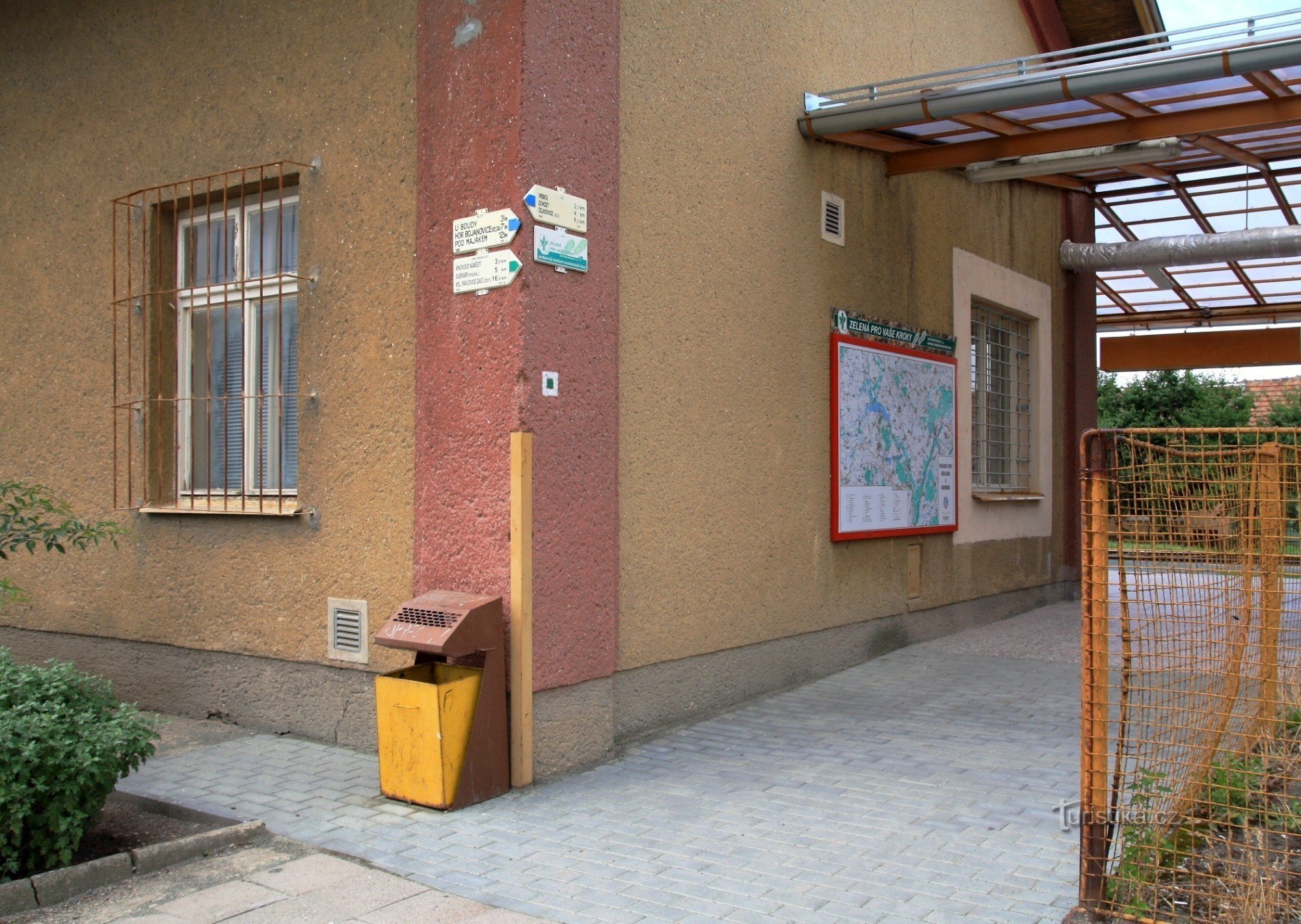 Nachází se na objektu železniční stanice. Prochází tudy modře značená turistická cesta a nově i zelená značka. Modrá vede jedním směrem přes rozcestí U boudy, kolem vrcholu Přední kout a končí v Křepicích. Opačným směrem prochází Kobylím, vystoupá na Vrbici a končí v Čejkovicích. Zelená pak směřuje údolím Trkmanky do sklepního areálu Kraví Hora a přes Kravihorskou rozhlednu a Němčičky dojede až…