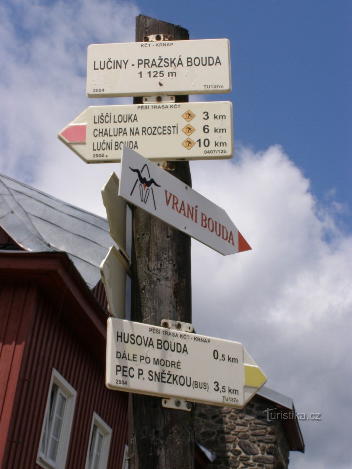 Turistický rozcestník, který se nachází na Lučinách u známé Pražské boudy, ukazuje turistům cestu do tří směrů. Po značce červené ve směru Chalupa na Rozcestí, Liščí louka, Lesní bouda, rozc. Pod Lesní boudou, Hrnčířské Boudy - Kolínská bouda, Černá Hora, Svoboda nad Úpou, po značce zelené ve směru Chalupa Na Rozcestí, Dvorská bouda, Černý potok, Lučiny - Pod Slatinnou strání, Javorské boudy,…
