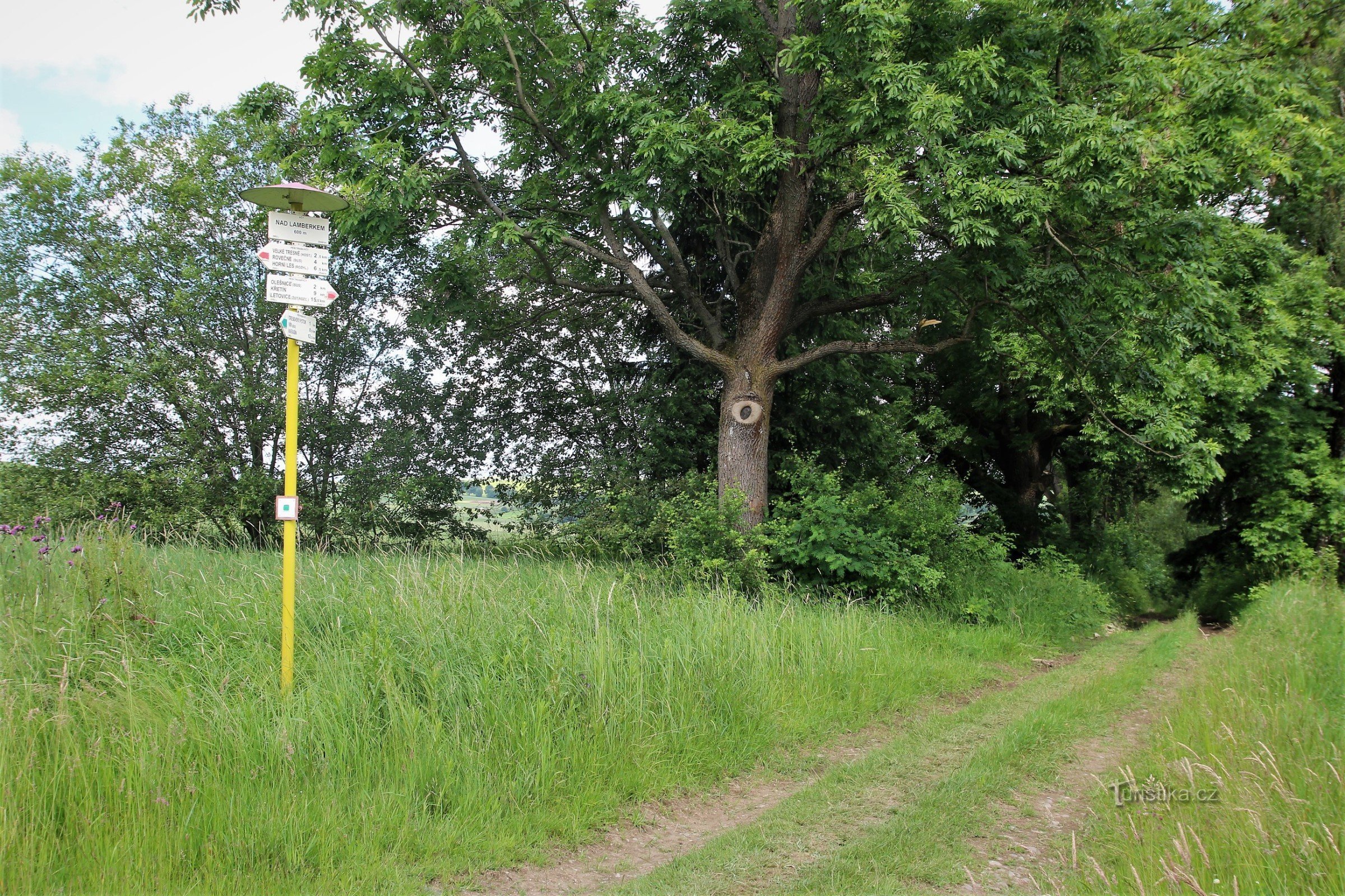Rozcestí se nachází severozápadně od města Olešnice uprostřed rozlehlých luk na příjezdové cestě k zámečku Lamberku. Prochází tudy červeně značená turistická cesta a začíná i zelená značka. Červená vede do Olešnice a dále pokračuje přes Ústup, Křetín a Lazinov až do Letovic. Opačným směrem pak pokračuje na Velké Tresné a Rovečné a odtud pak vystoupá až na vrchol Horního lesa k rozhledně. Zelená…