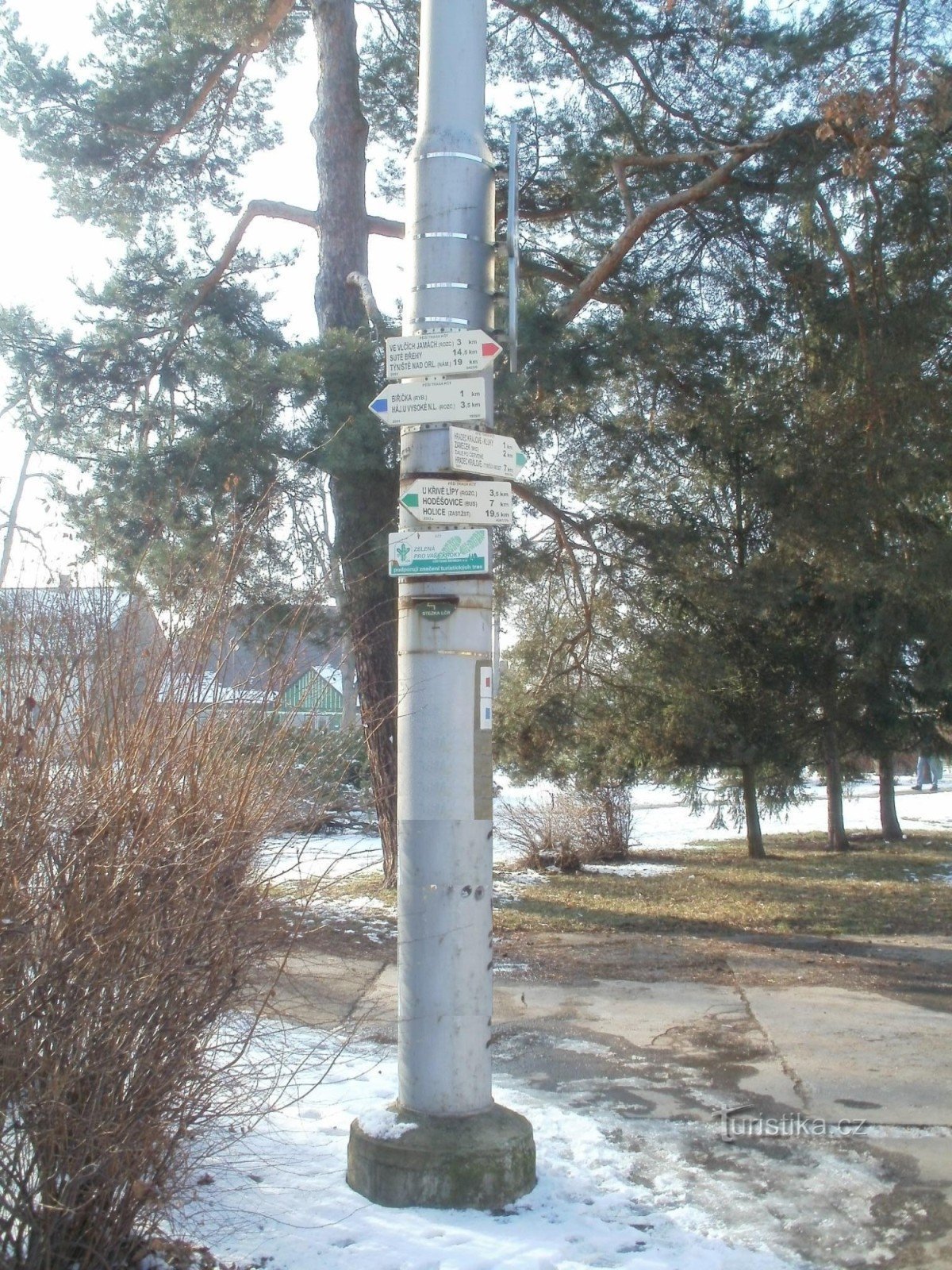 Turistické rozcestí u zastávky mhd na Svatováclavském náměstí ukazuje turistům cestu v třech směrech. Po značce modré od rozcestí k hájovně u Vysoké nad Labem, po značce zelené ve směru rozcestí Pod kopcem sv. Jana - Horní Jelení a po zn. červené od rozcestí do Týniště nad Orlicí.