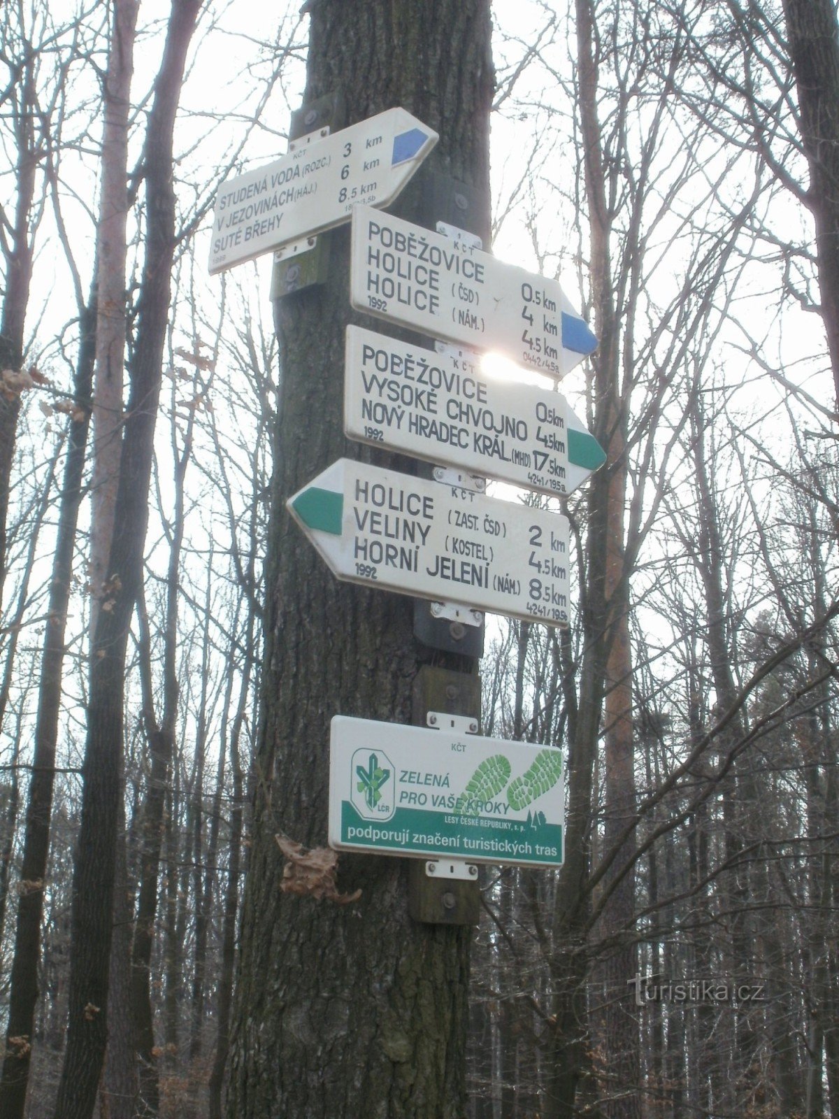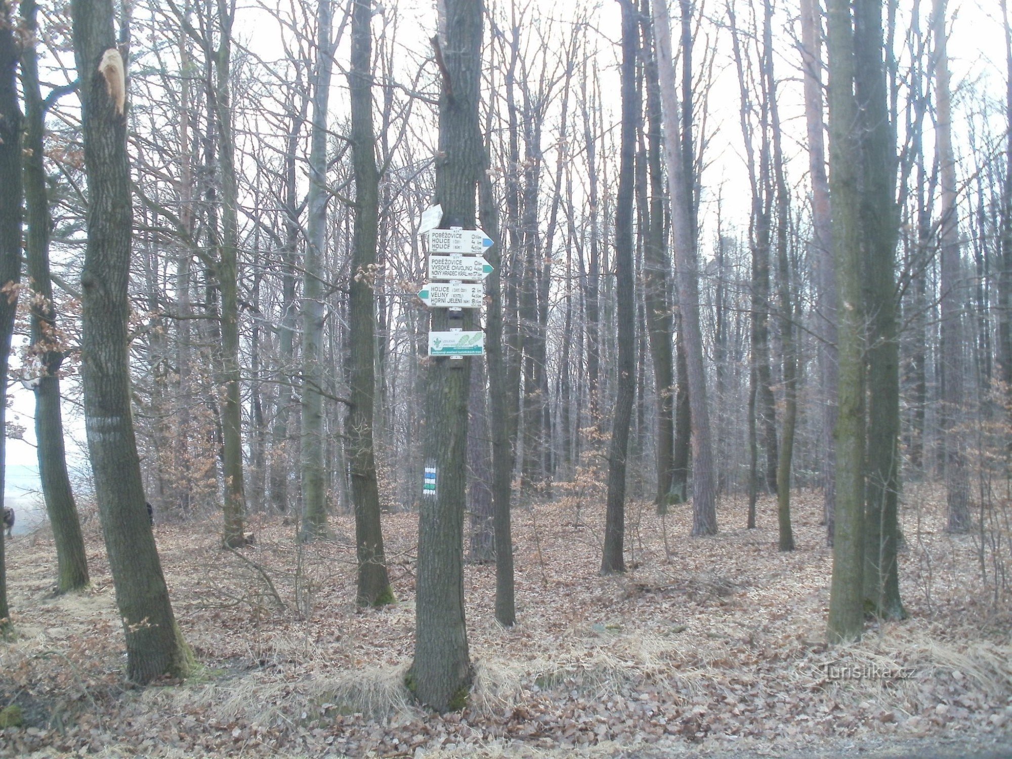 Turistický rozcestník, který se nachází při silnici v lokalitě zvané Odmezení, ukazuje turistům cestu do dvou směrů. Po značce zelené ve směru Nový Hradec Králové - Horní Jelení a po značce modré ve směru Suté Břehy - Holice.