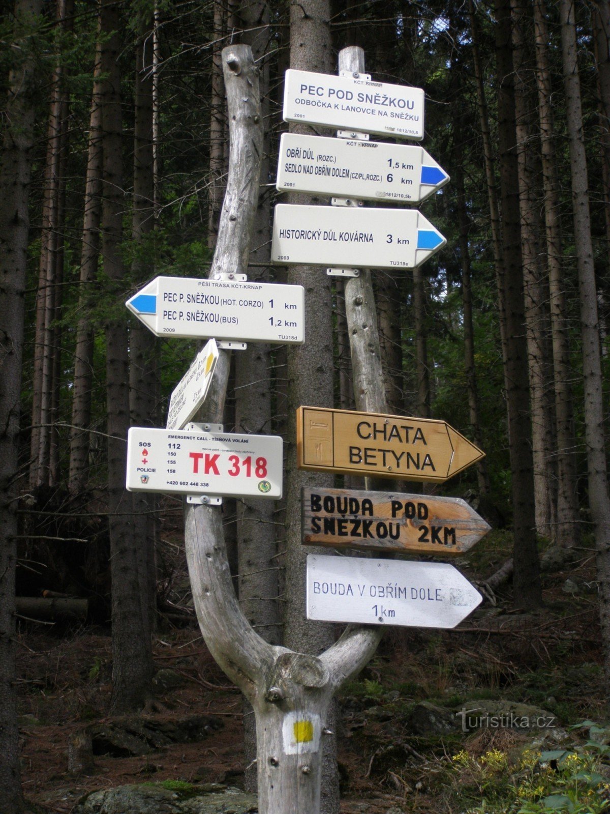 Turistický rozcestník na konci Pece pod Sněžkou ukazuje turistům cestu po modré značce ve směru Pec pod Sněžkou - Sedlo nad Obřím dolem a žlutě značenou odbočku k lanové dráze na Růžohorky, resp. na Sněžku.