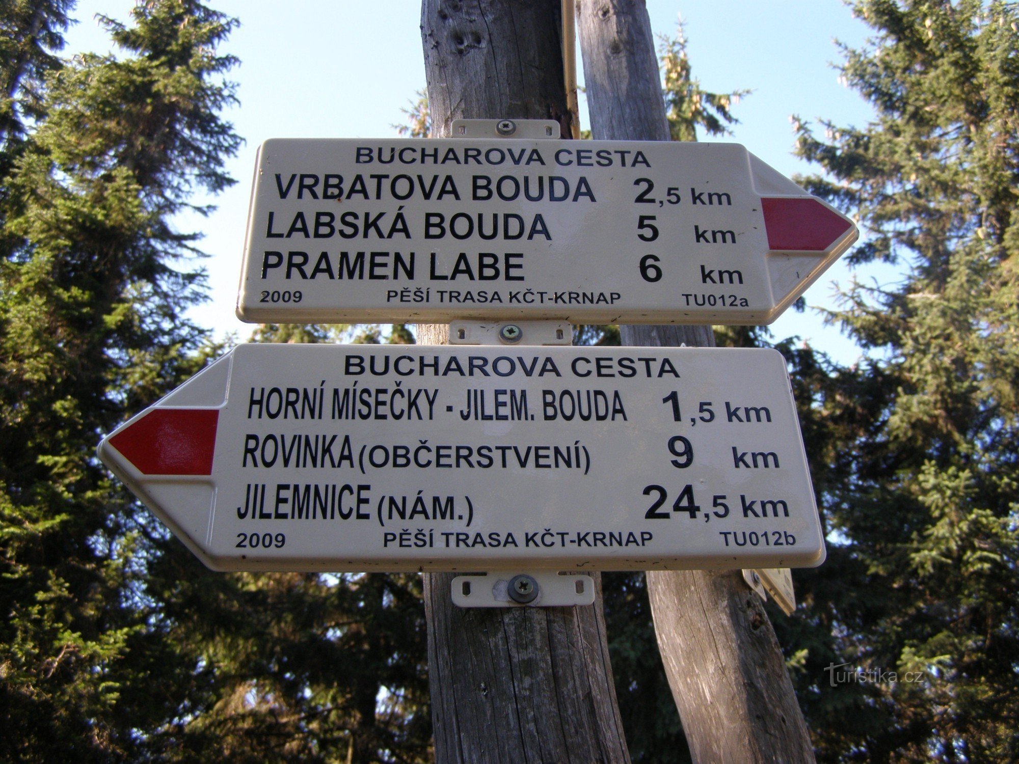 Turistický rozcestník, který se nachází pod Šmídovou vyhlídkou, ukazuje turistům cestu do dvou směrů. Po značce červené ve směru pramen Labe, Labská bouda, Vrbatova bouda - Horní Mísečky, Rovinka, Přední Žalý, Hrabačov, Jilemnice a po spojovací žluté značce od Horních Míseček přes Mědvědín k rozcestí pod Šmídovou vyhlídkou.