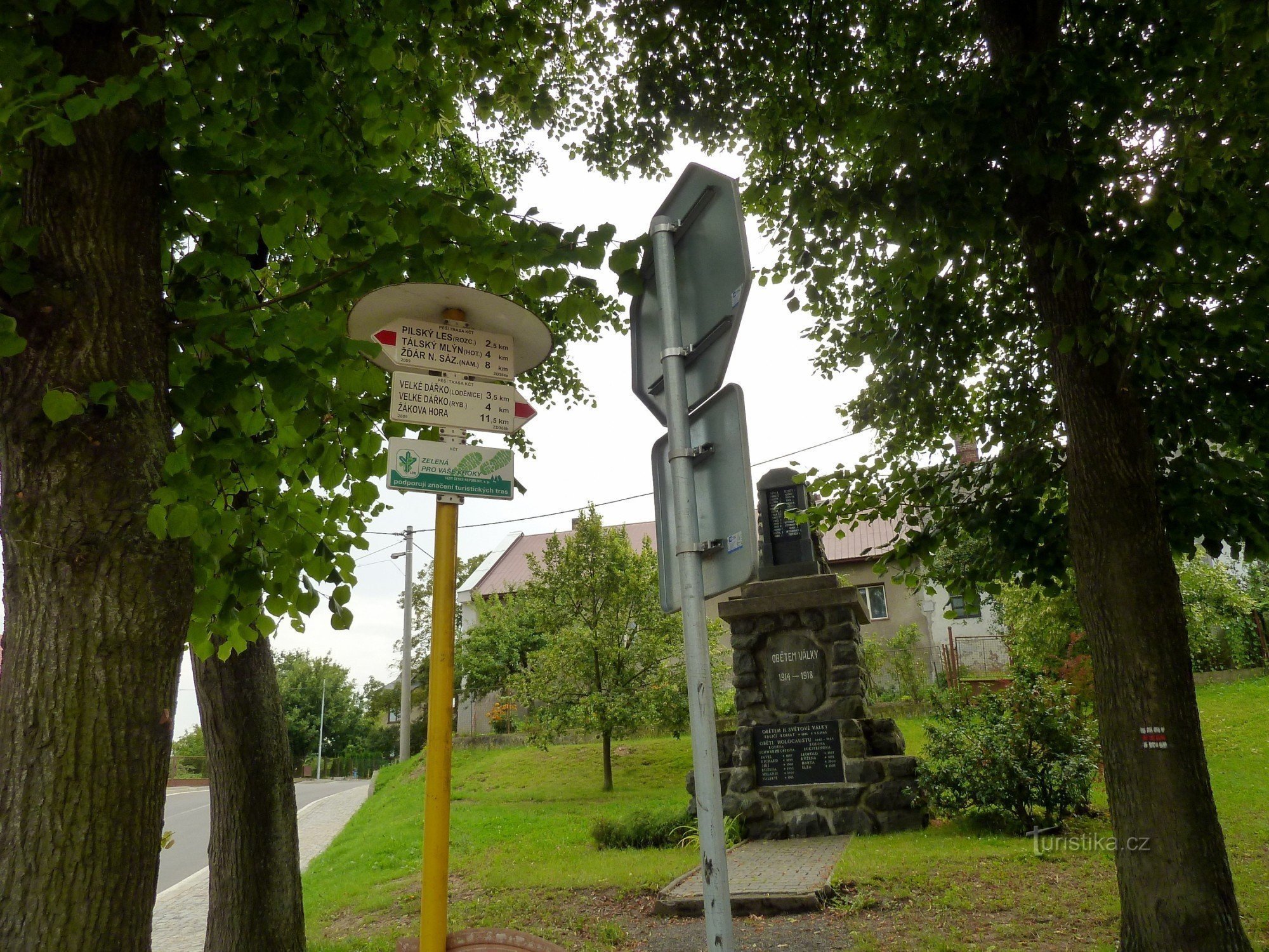 Nachází se na výrazné křižovatce obce u pensionu Červeňák. Prochází zde červeně značená turistická cesta, která vede jedním směrem na rozcestí k Tálskému mlýnu a dále kolem zámku na žďárské náměstí Republiky. Druhým směrem jde k rybníku Velké Dářko, do Škrdlovic a přes Tisůvku na Žákovu horu.