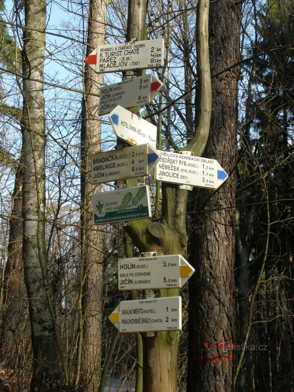 Turistický rozcestník, který se nachází při vstupu do skalního města, ukazuje turistům cestu do více směrů. Po značce červené ve směru Jičín - Prachovské skály, po značce žluté také ve směru Jičín - Prachovské skály a po značce modré ve směru Jinolické rybníky - Brada, Jičín. Zeleně je značena spojovací cesta mezi rozcestím a hotelem Pod Šikmou věží.