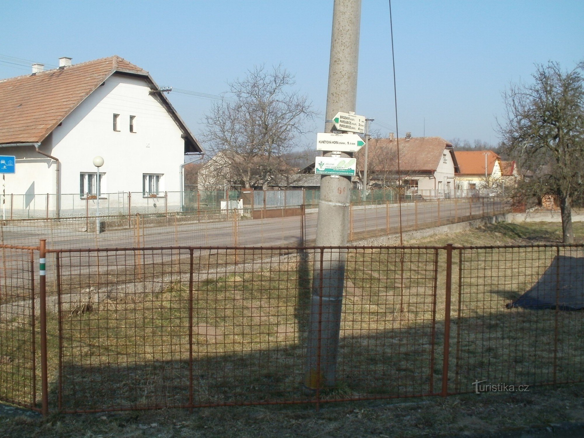 Turistický rozcestník, který se nachází cca 200 m severně od kapličky v obci Ráby, ukazuje turistům cestu po zelené značce ve směru Pardubice zámek - Kunětická hora.