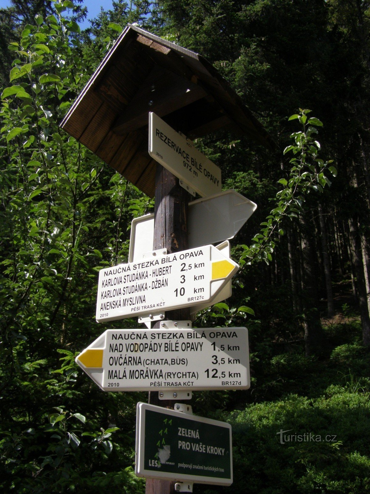 Turistický rozcestník, který se nachází ve spodní části údolí Bílé Opavy, ukazuje turistům cestu do dvou směrů. Po modré značce ve směru Vrbno pod Pradědem, Malá Hvězda, Karlova Studánka - Nad Vodopády Bílé Opavy, Ovčárna, Velký Kotel, Karlov, Malá Morávka a po značce žluté ve směru Malá Morávka, Karlov, Ovčárna, Pod Ovčárnou, Nad vodopády Bílé Opavy - Karlova Studánka, Malá Hvězda, Anenská…
