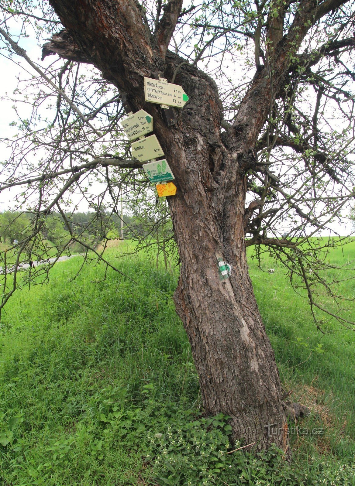 Nachází se za obcí u silnice směřjící k nádraží. Směrovky jsou umístěny na okraji odbočující polní cesty na kmenu staré jabloně. Prochází tudy zeleně značená turistická cesta. Ta směřuje jedním směrem do údolí Libochovky a odtud pak na Kutiny, Rojetín, Níhovský rybník, Březské a končí ve Velké Bíteši. Opačný směrem pak pokračuje na Chytálky, vystoupá na Pasník a končí v Tišnově u nádraží. Odtud…