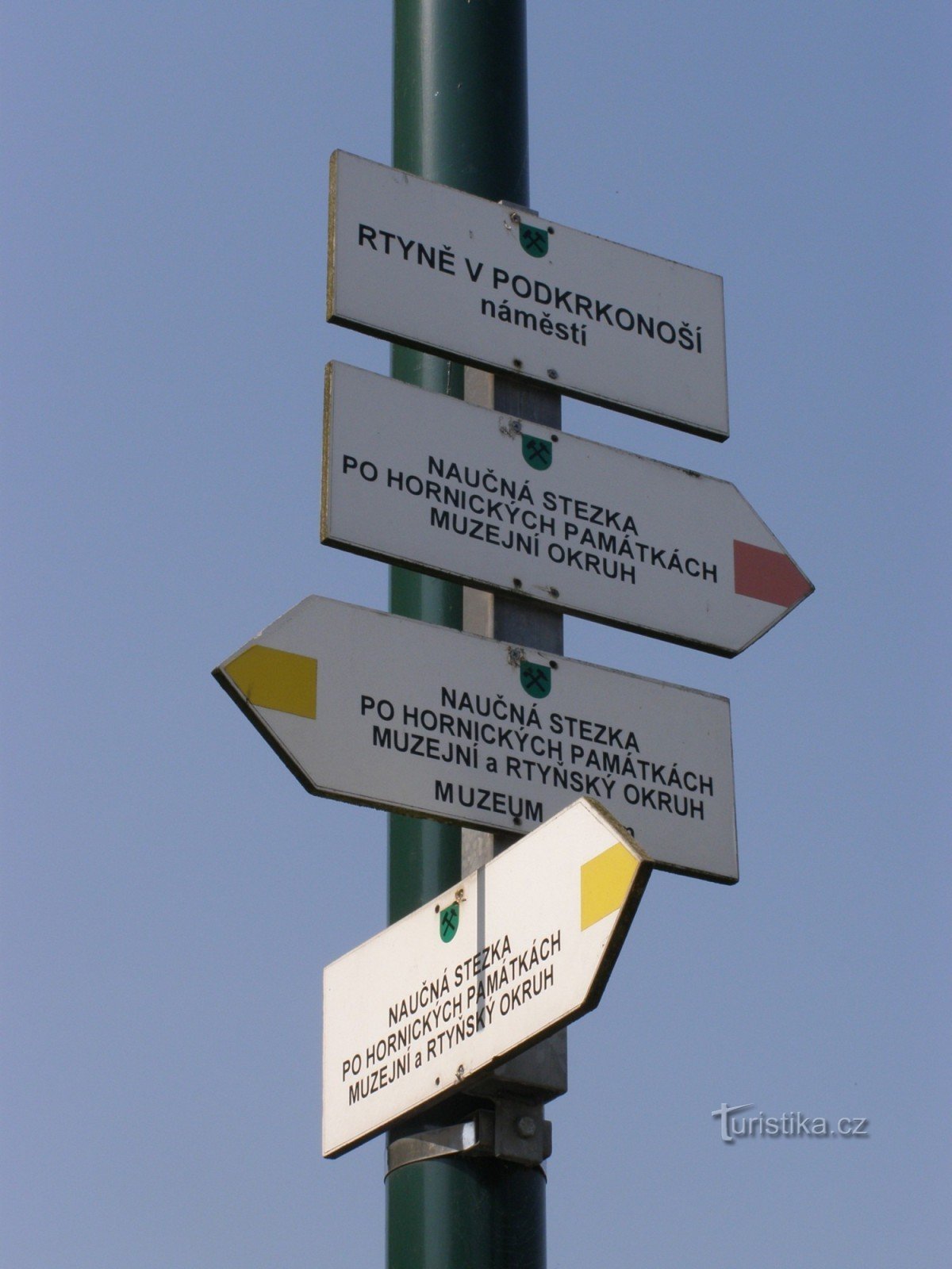 Turistický rozcestník, který se nachází na náměstí Horníků, ukazuje turistům cestu po dvou rtyňských Naučných stezkách. Červeně je značena NS Po hornických památkách - muzejní okruh, žlutě je značena NS Po hornických památkách - muzejní a rtyňský okruh.