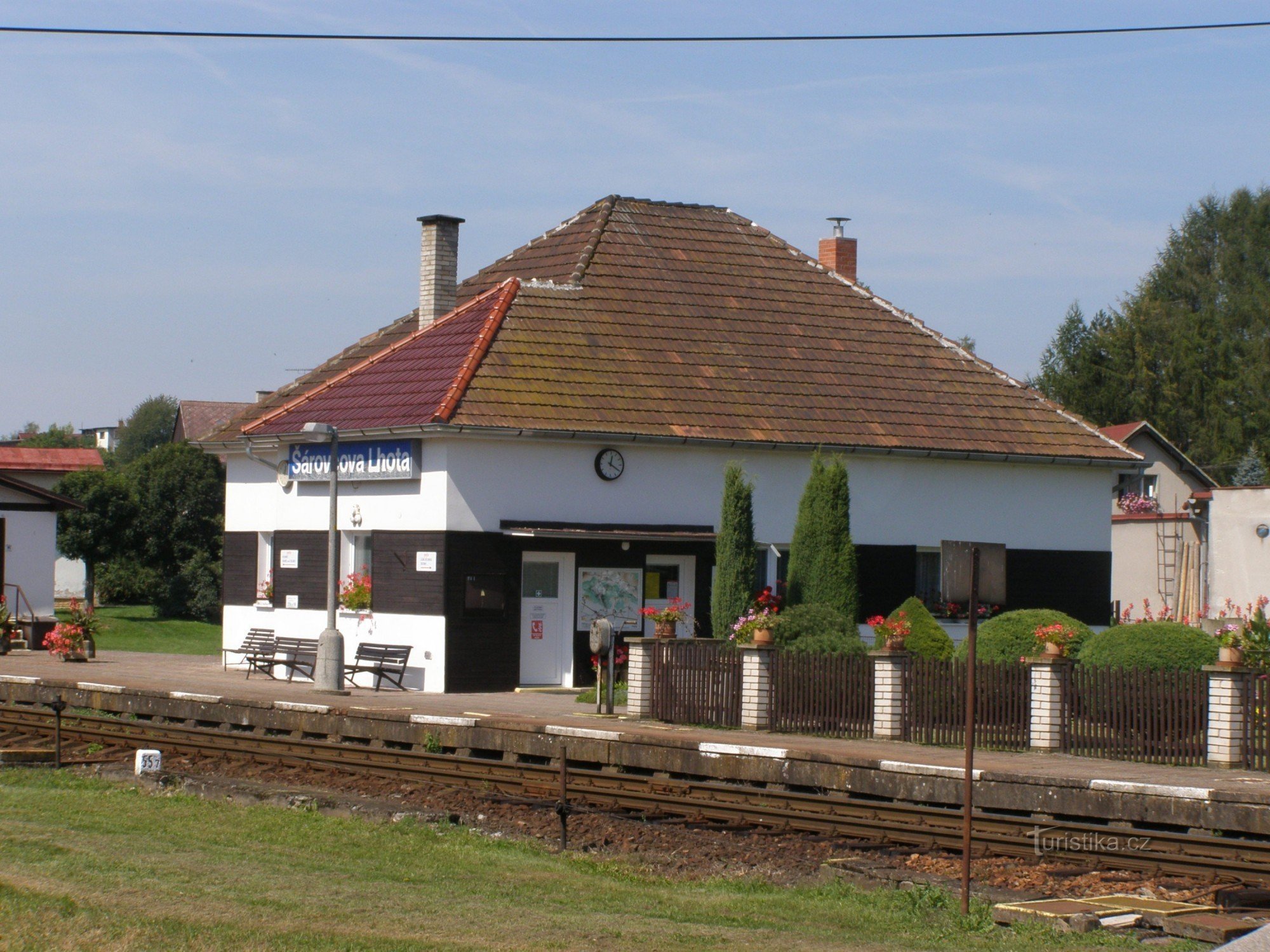 Turistický rozcestník, který se nachází u železniční stanice v Šárovcově Lhotě, ukazuje turistům cestu po zelené značce ve směru Ostroměř - Lázně Bělohrad.
