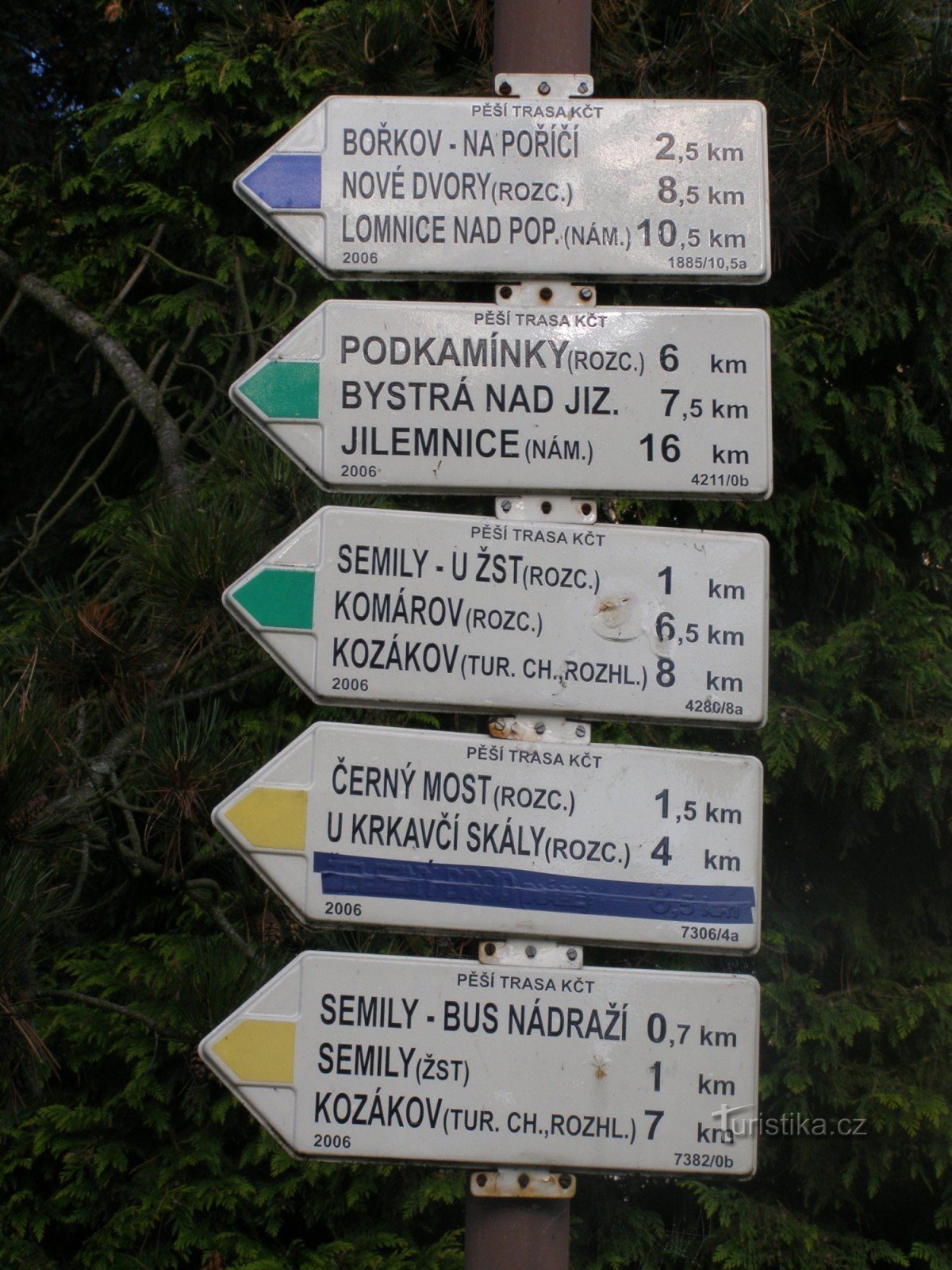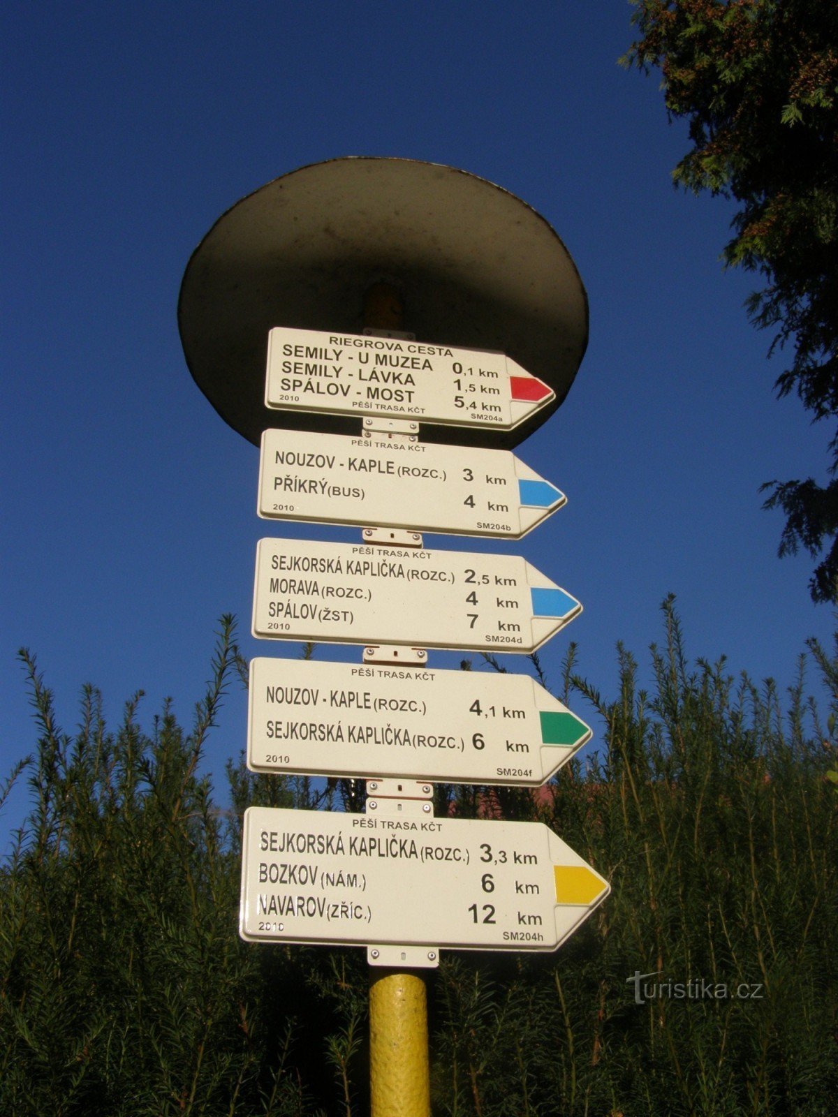 Turistický rozcestník, který se nachází v západní části Riegrova náměstí, ukazuje turistům cestu do čtyř směrů. Po červeně značené Riegrově stezce ve směru Semily - Spálov. Značky modrá, žlutá a zelená se zde dělí do tří směrů:
