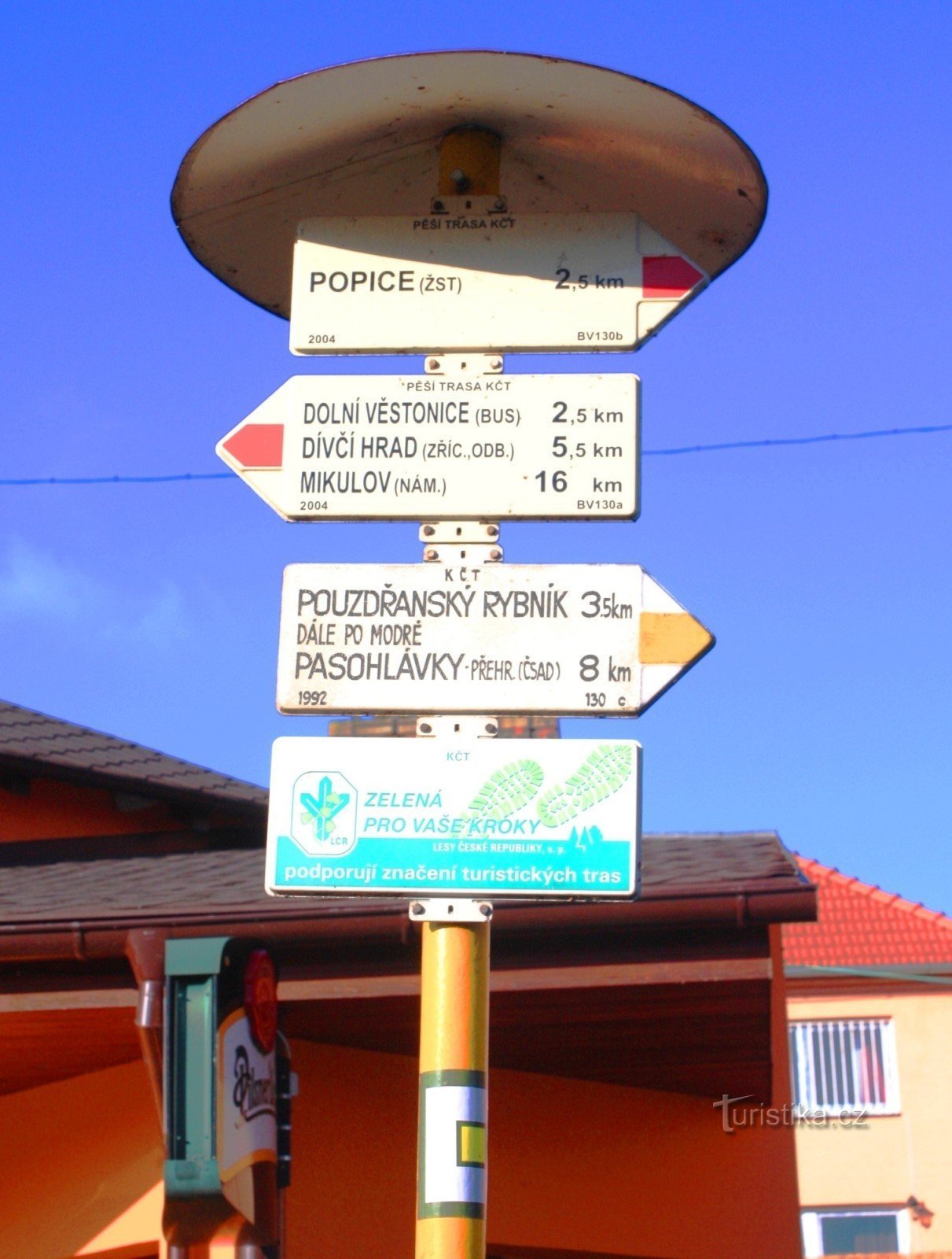 Nachází se na zdejší návsi u restaurace Isis. Prochází tudy červeně značená turistická cesta, která směřuje jedním směrem k vlakové zastávce do Popic a druhým na po hrázi Věstonické nádrže do Dolních Věstonic a dále pak na hlavní hřeben Pálavy a končí v Mikulově. Začíná zde žlutá spojka, která vede Sklepní ulicí podél břehu Věstonické nádrže až k modře značené cestě vedoucí z Pouzdřan do kempu…