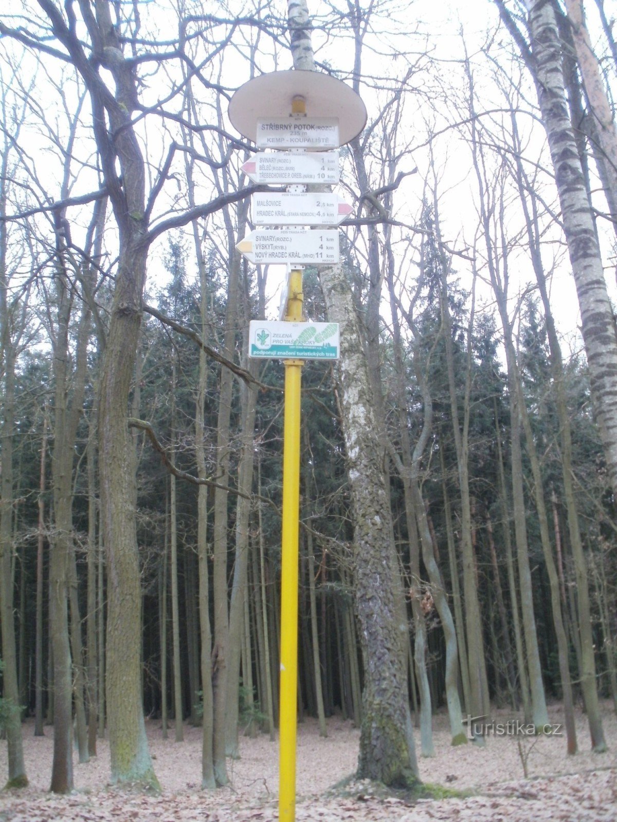 Turistický rozcestník Stříbrný potok, který se nachází v blízkosti kempu u Stříbrného rybníku, ukazuje turistům cestu ve dvou směrech. Po červené značce ve směru Hradec Králové - Třebechovice pod Orebem, dále Opočno a po značce žluté ve směru Hradec Králové, rozcestí u staré nemocnice - rozcestí U křivé lípy.