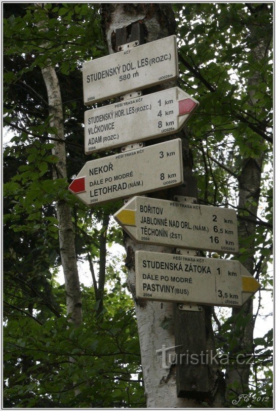 Turistické rozcestí leží na okraji lesa pod kopcem Studený. Procházejí tudy tyto turisticky značené trasy: