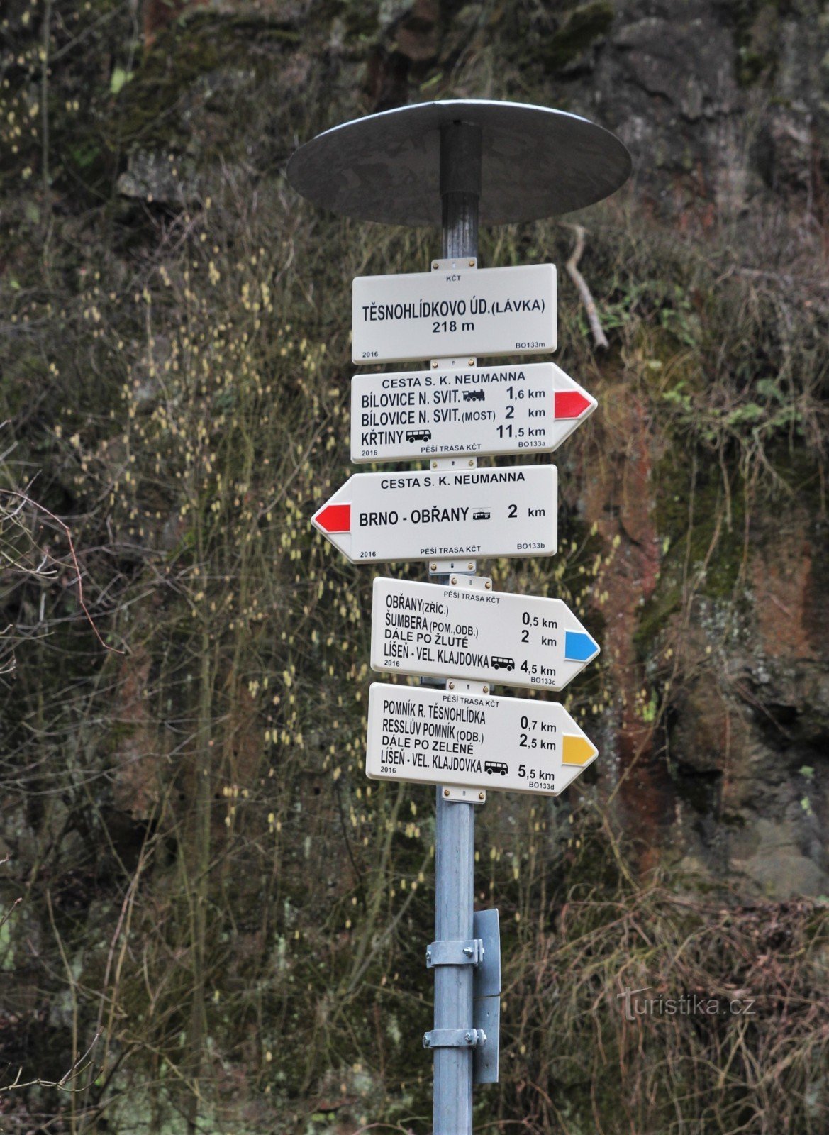 Nachází se na pravém břehu řeky Svitavy u nově otevřené lávky, jejíž provoz byl zahájen 14. 2. 2016, zavěšené ve stěně železničního mostu překonávající v dostatečné výši tok řeky. Přes ní sem přechází po lávce žlutě a modře značená turistická cesta, které zde končí. Po zdejší příbřežní cestě vede červená značka, která jedním směrem pokračuje po vodě do Obřan k MHD, proti vodě pak do Bílovic nad…