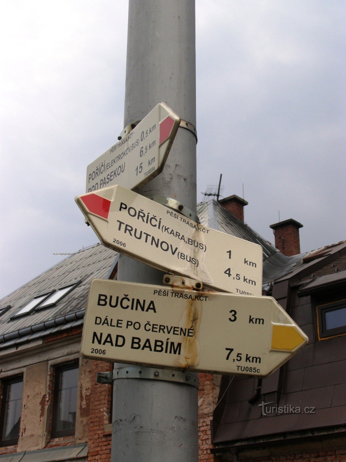 Turistický rozcestník, který se nachází ve Voletinské ulici nedaleko hříště v Trutnově – Poříčí, ukazuje turistům cestu do dvou směrů. Po červeně značené Cestě bratří Čapků ve směru Pomezní boudy - Malé Svatoňovice a po značce žluté ve směru Poříčí - Bučina.