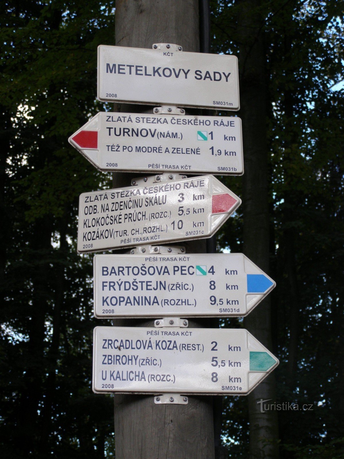 Turistický rozcestník, který se nachází u Metelkových sadů, ukazuje turistům cestu do tří směrů. Po značce modré ve směru Turnov - Dolánky, Bartošova pec, Frýdštejn, Kopanina, po značce zelené ve směru Prokopské údolí, Věžický rybník, Valdštejn - Zrcadlová koza, Zbirohy, Chata U kalicha a po značce červené ve směru Kozákov, Klokočské průchody - Hlavatice, Valdštejn, Hrubá Skála, Trosky.