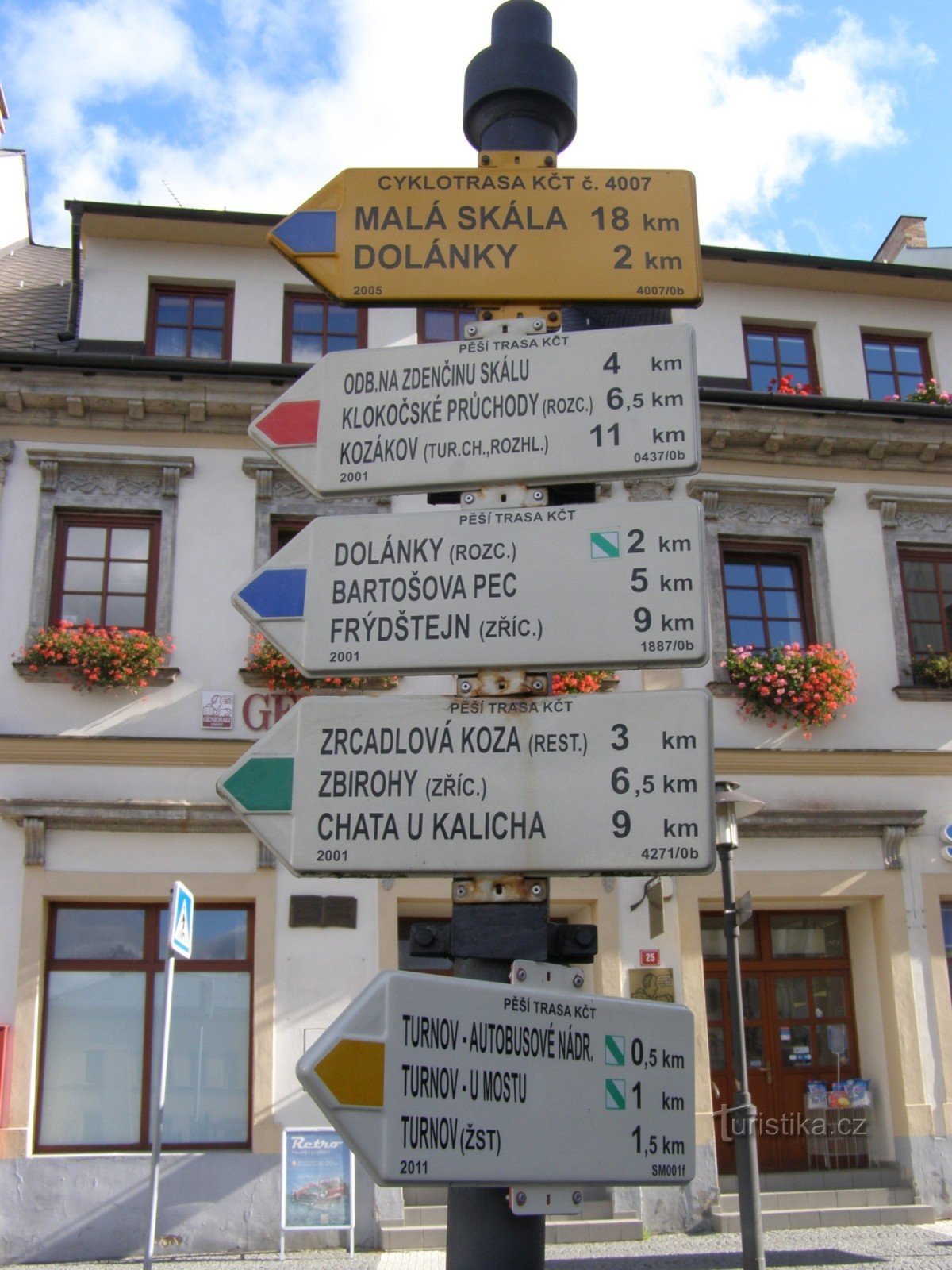 Turistický rozcestník, který se nachází na náměstí Českého ráje v Turnově, ukazuje turistům cestu do čtyř směrů. Po žluté značce ve směru Turnov žst, Turnov bus nádraží - Klokočské průchody, Rotštejn, Kozákov, po značce modré ve směru Turnov - Dolánky, Bartošova pec, Frýdštejn, Kopanina, po značce zelené ve směru Prokopské údolí, Věžický rybník, Valdštejn - Zrcadlová koza, Zbirohy, Chata U…