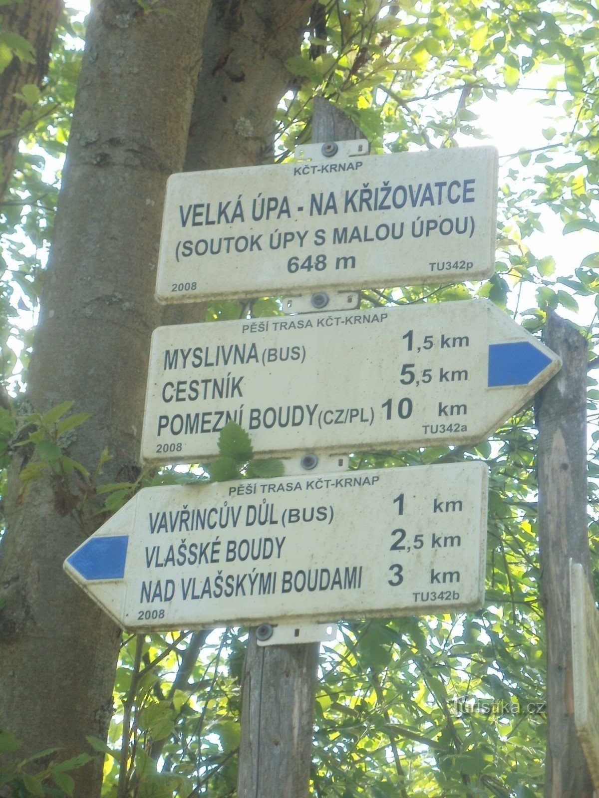 Turistický rozcestník, který se nachází u soutoku Úpy s Malou Úpou, ukazuje turistům cestu do dvou směrů. Po značce žluté ve směru soutok Úpy s Malou Úpou - Janovy boudy, Růžohorky, Sněžka a po značce modré ve směru Vlašské boudy, Vavřincův důl - Myslivna, Cestník, Pomezní Boudy.