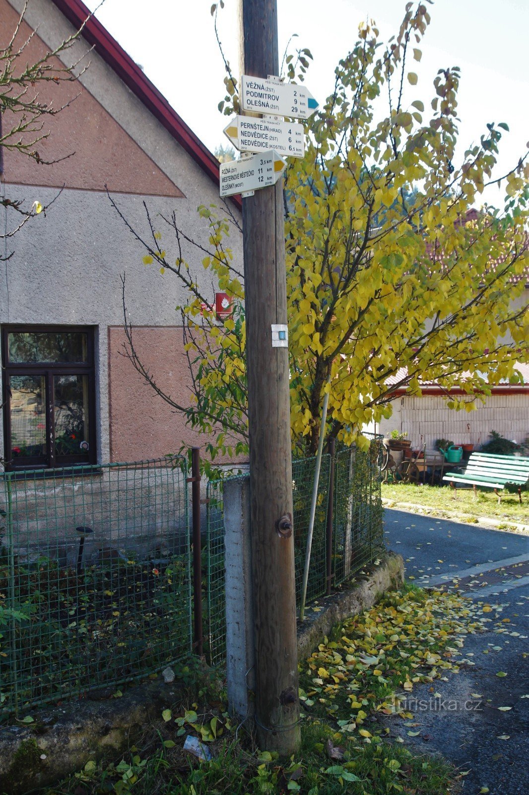 Turistické rozcestí se nachází na místní návsi na křižovatce hlavních komunikací v obci. Prochází tudy žlutě značená turistická cesta a začíná zde modrá značka. Žlutá vede jedním směrem do Rožné, dále do Dolní Rožínky, okrajem Blažkova a Westernového městečka Šiklův Mlýn do Olešínek. Opačným směrem pak pokračuje na okraj Smrčku a přes vyhlídku Maria Laube a hrad Pernštejn dorazí do Nedvědice.…