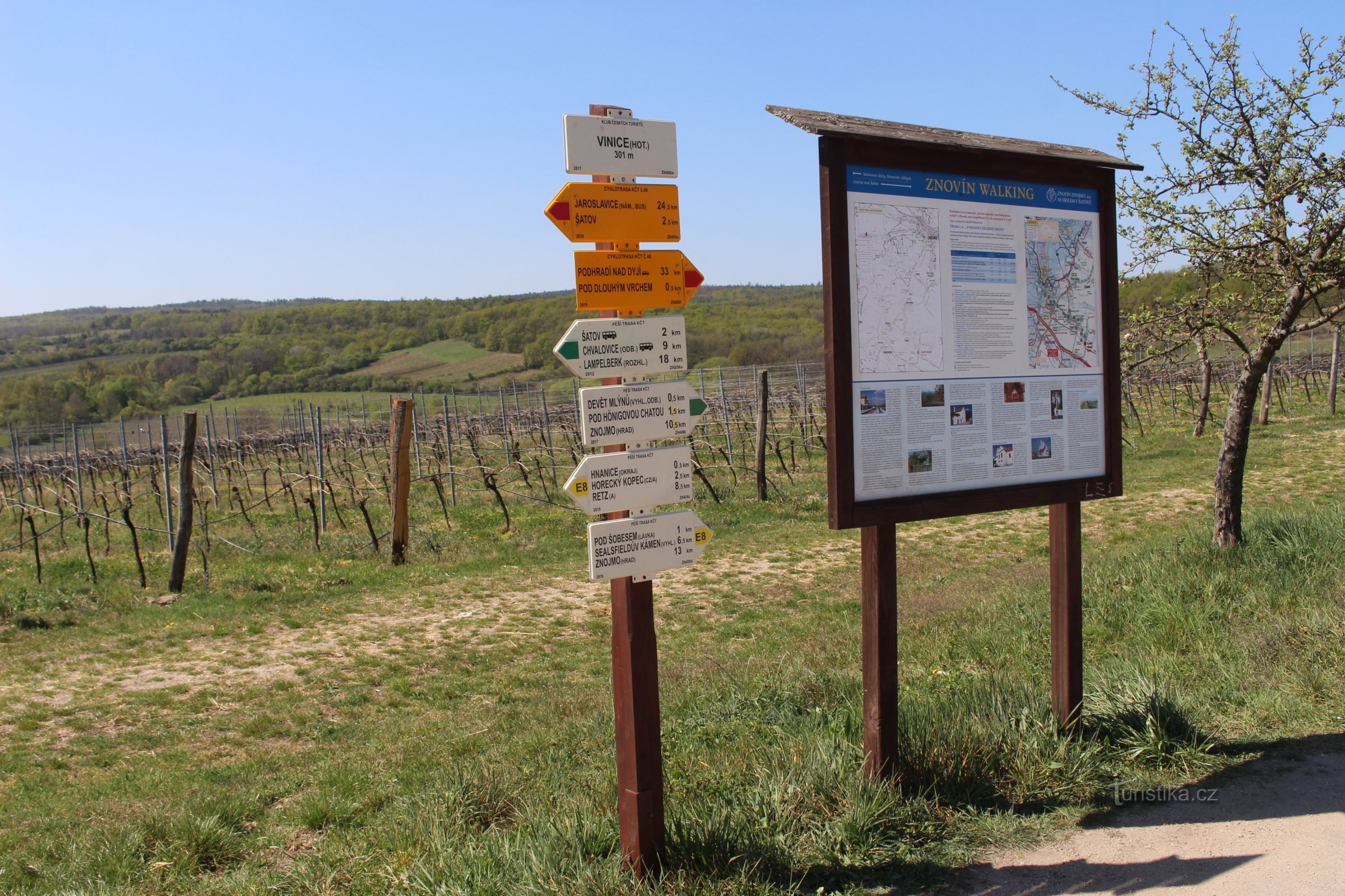 Turistické rozcestí se nachází na okraji areálu hotelu Vinice Hnanice. Prochází tudy zeleně a žlutě značená turistická trasa. Zelená vede jedním směrem k hotelu Happy Star a dále přes Šatov do Chvalovic. Opačným směrem pak pokračuje přes vyhlídku Devět mlýnů až na Havranické vřesoviště, kde se napojuje na červenou magistrálu vedoucí národním parkem Podyjí a po ní se dá dojít do Vranova nad Dyjí,…