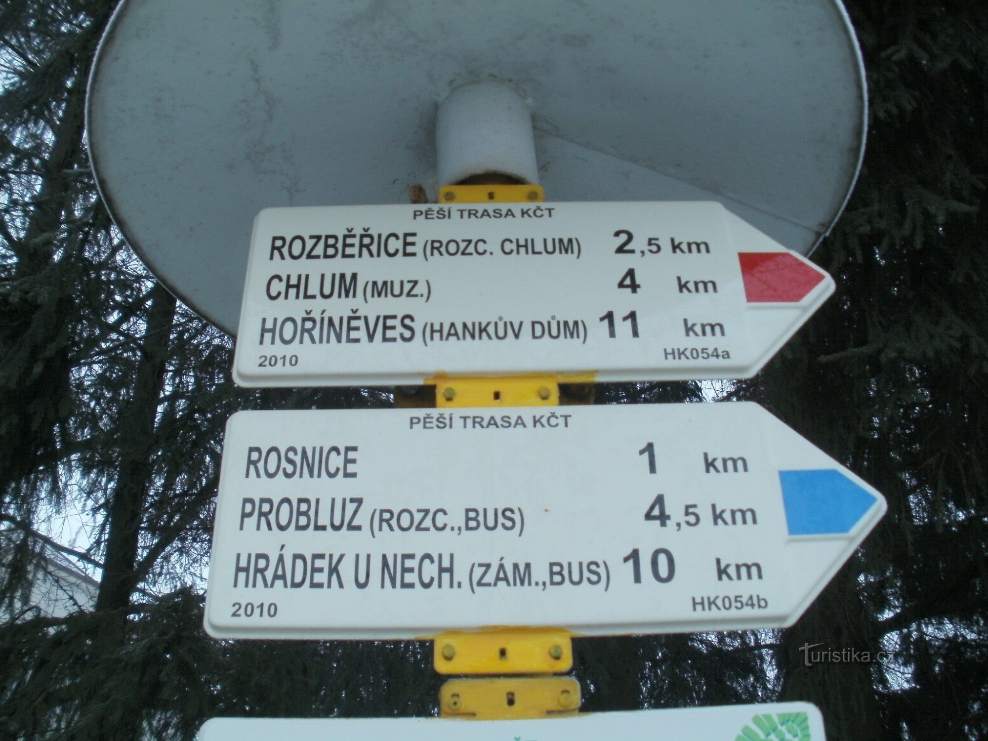 Turistický rozcestník, který se nachází u nádraží ve Všestarech, ukazuje turistům cestu ve dvou směrech. Po značce červené ve směru Všestary – Hořiněves (přes bojiště na Chlumu) a po značce modré ve směru Všestary - Hrádek u Nechanic.
