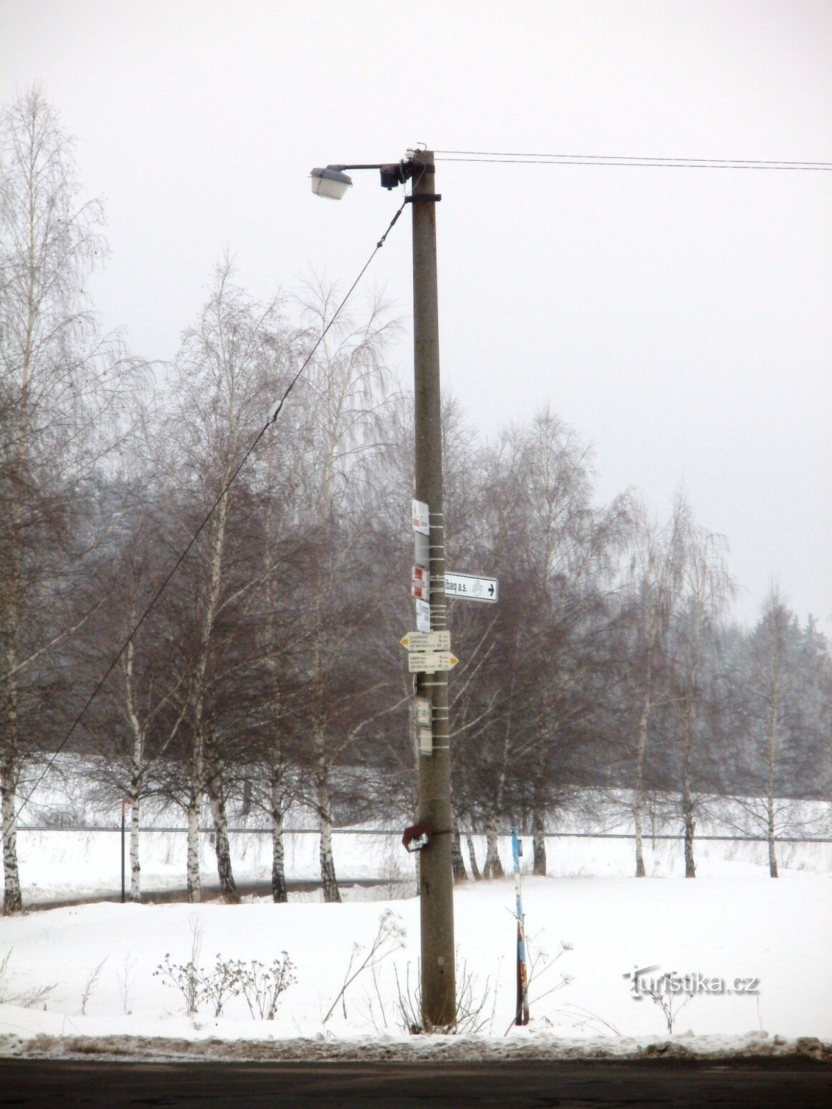 Turistický rozcestník, který se nachází u železničního přejezdu mezi Žamberkem a Dlouhoňovicemi, ukazuje turistům cestu po žluté značce ve směru Rokytnice v Orlických horách, Žamberk - Žampach, Ústí nad Orlicí.