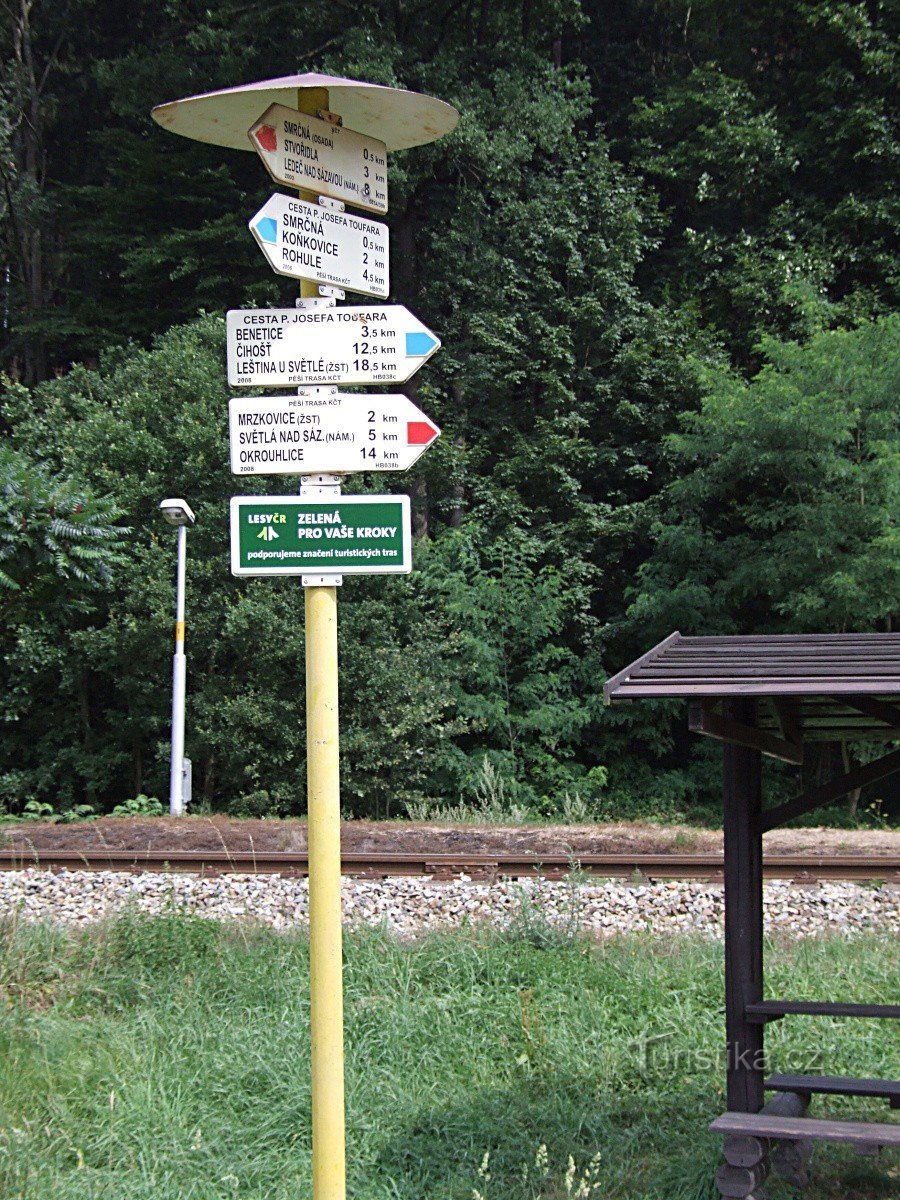 Pro turisty vystupující z vlaku ve stanici Smrčná na trase Ledeč n.S. - Světlá n.S. je přímo u železniční zastávky umístěný rozcestník, jehož šipky ukazují směr červené a modré turistické značky. Obě trasy okolo zastávky procházejí společně, a to v úseku dlouhém asi 500 m. Červená značka, která po celé své délce kopíruje údolí řeky Sázavy sem přichází od východu přes Světlou nad Sázavou od…