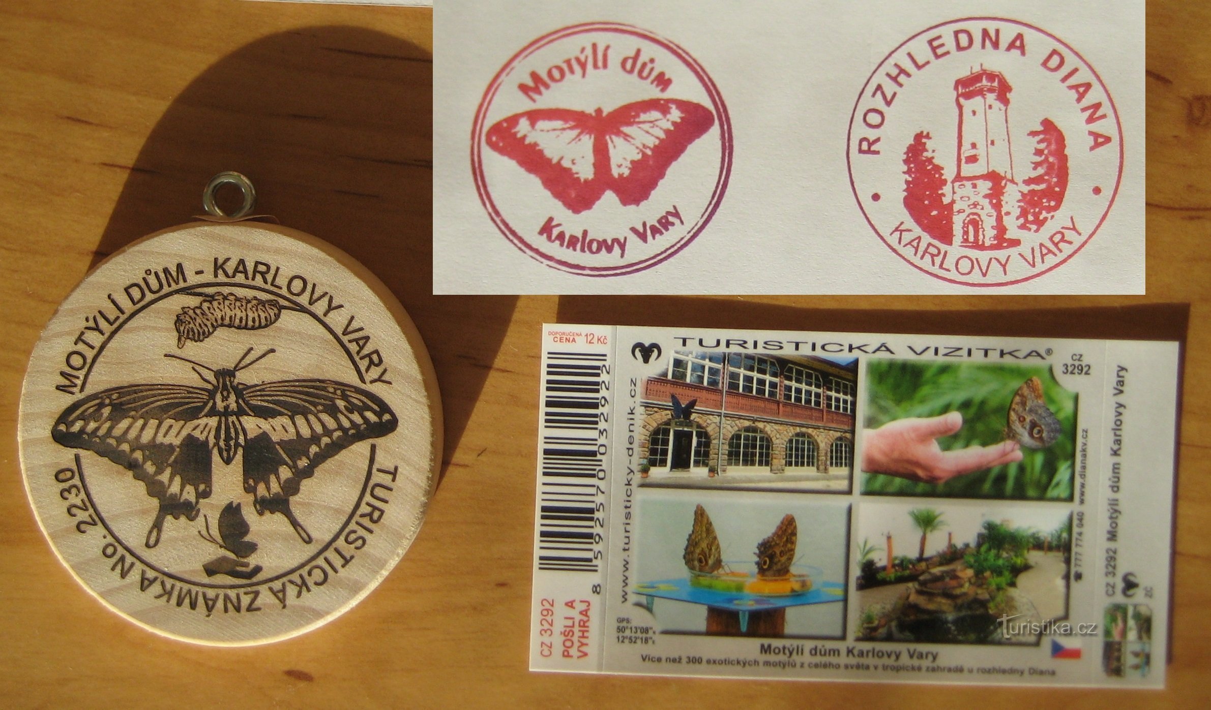 Turistická známka č. 2230 - Motýlí dům, lze zakoupit v Motýlím domě v Karlových Varech v areálu rozhledny Diana... Dále lze zde zakoupit TV č. CZ 3292A zjískat tyto razitka - viz. fotoDoporučujeme: 360° video - Motýlí dům ve virtuální realitě na VRČesko.cz