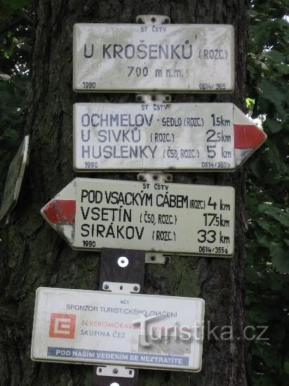 Rozcestník červené a žluté turistické značky severovýchodně od Vsetína. V blízkosti místo dalekého Rozhledu.