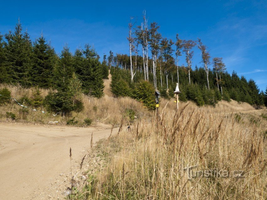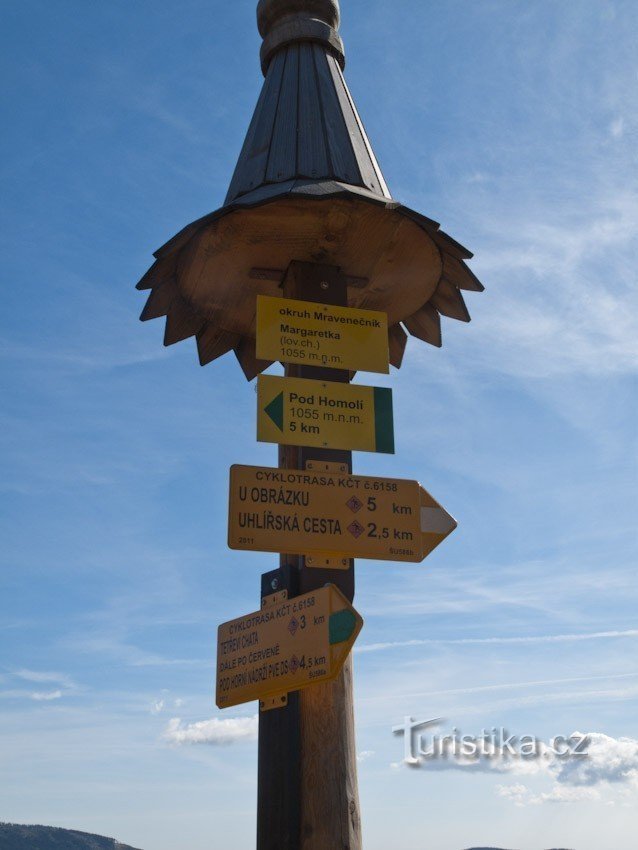 Rozcestí terénních cyklotras pod Mravenečníkem. Doráží sem bílá cyklotrasa od Uhlířské cesty, která tedy dělá určitou spojku od hlavní červené cyklotrasy, značící cestu od Loučné nad Desnou k Dlouhým stráním se zeleně značenou cyklotrasou, která vlastně vytváří okruh kolem celého masivu Mravenečníku, tedy i s Dlouhými stráněmi , Vřesníkem a vlastně i samostatnější Homoli. Místo nabízí pěknou…